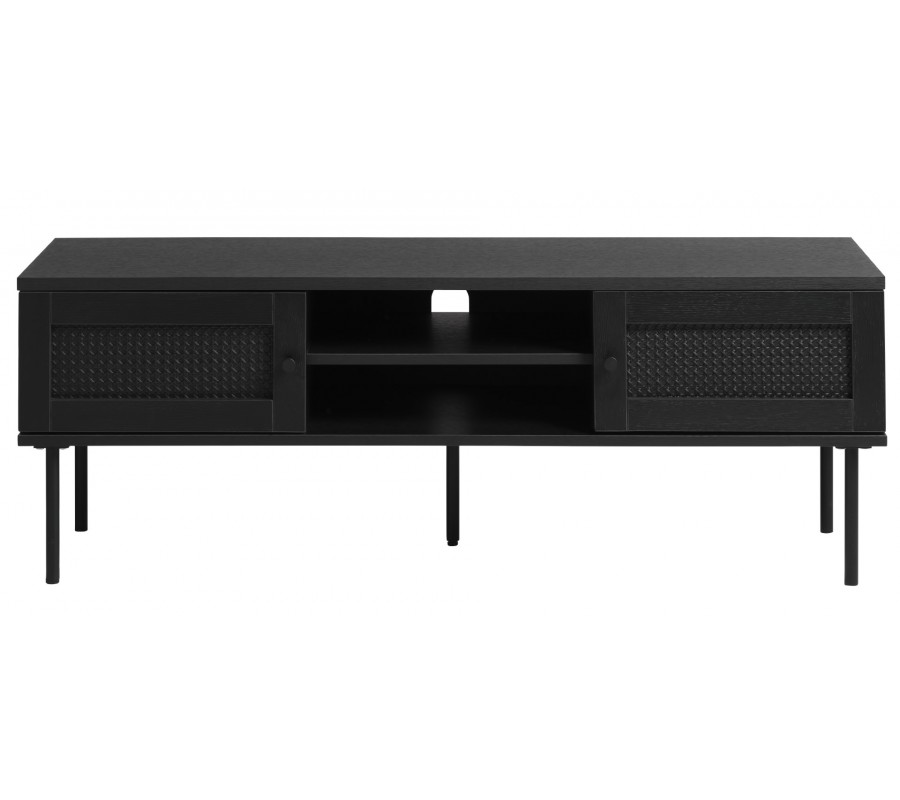 Retro industriální černý TV stolek Malmo se dvěma dvířky s ratanovým vídeňským výpletem a dvěma policemi 120 cm