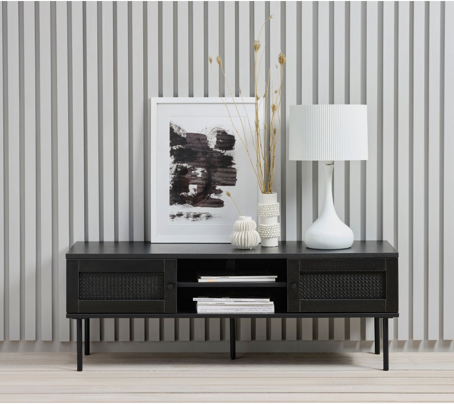 Televizní stolek Malmo dodá vašemu obývacímu pokoji moderní design s jemným retro akcentem a nádechem industriální estetiky. Nabízí prakticky řešený úložný prostor a černá provedení se snadno kombinuje s dalším nábytkem.