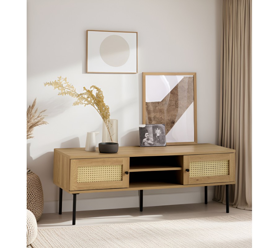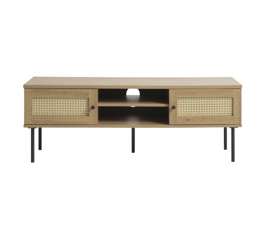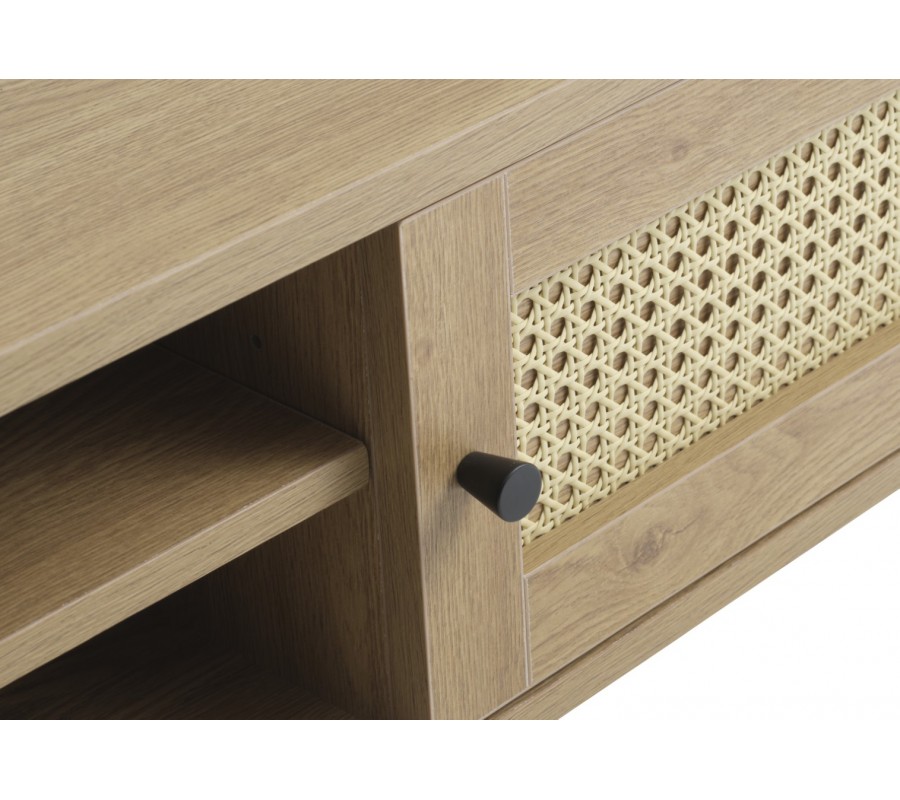 Retro skandinávský TV stolek Malmo ve světlém hnědém dubovém dekoru s ratanovým výpletem se dvěma dvířky a policemi 120 cm