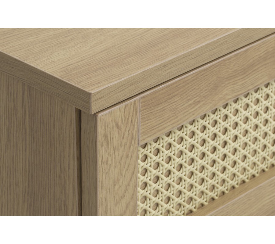 Korpus je vyroben z kvalitní MDF dýhy s melaminovou povrchovou úpravou, zajišťující vysokou odolnost vůči vlivům každodenního používání. Provedení ve světlé hnědé barvě s dubovým dekorem vytváří typický teplý skandinávský vizuál. Dominantní dekorativní prvek tvoří béžový ratanový výplet na dvířkách s vídeňským vzorem, který působí elegantním retro dojmem.