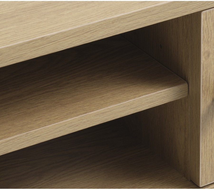 Stolek má obdélníkový tvar, s hladkou vrchní deskou, která poskytuje dostatek místa na televizor i dekorace. Pod ní se nachází úložný prostor, členěný na tři sekce. Boční jsou tvořeny dvěmi jednodveřovými skříňkami s interiérem v plné výšce, zatímco střední část je předělena na dvě police s poloviční výškou. Jejich zadní stěnu doplňuje praktický otvor pro vedení kabelů a jsou tak vhodné i pro uložení elektroniky a televizního příslušenství.