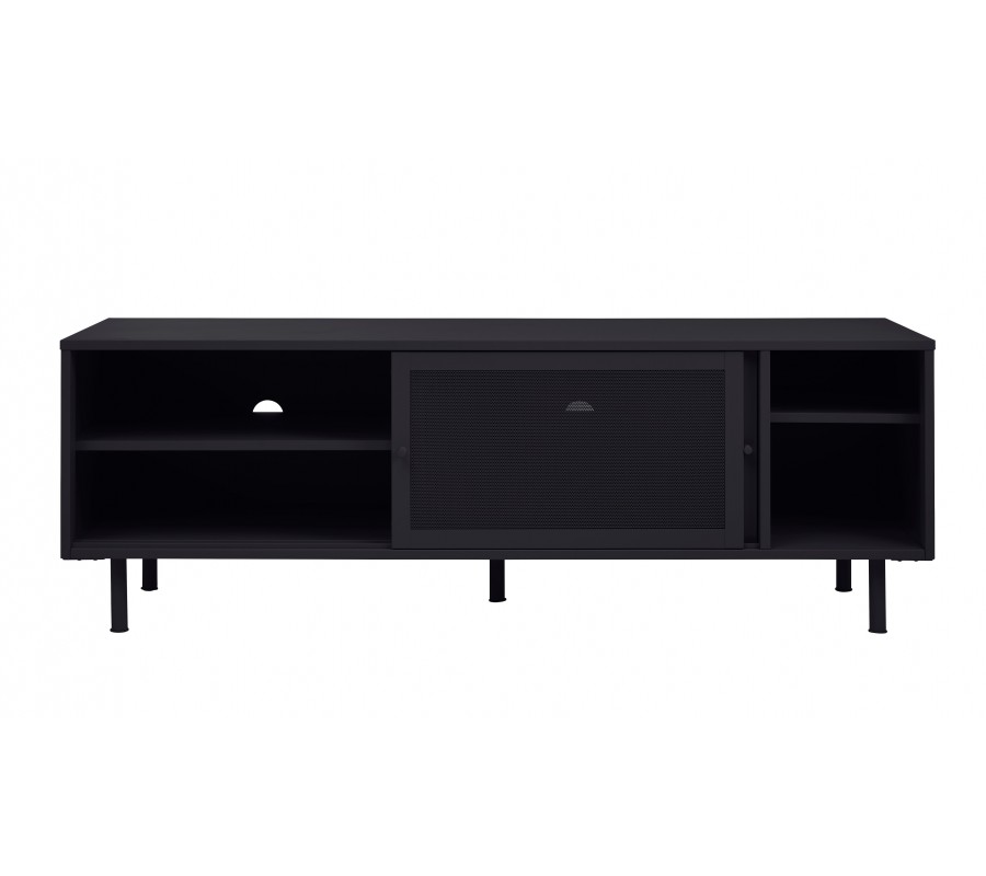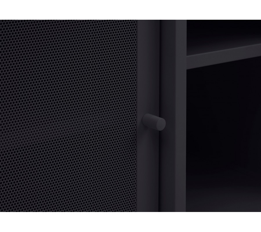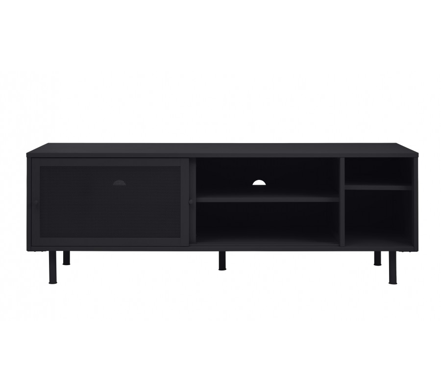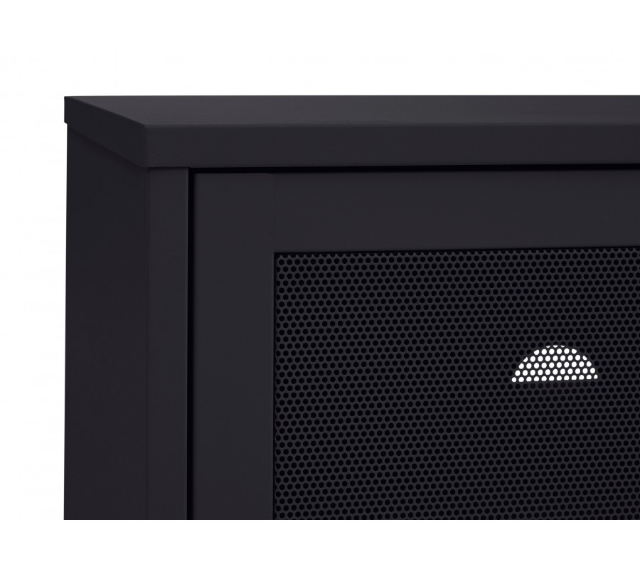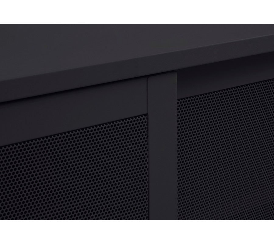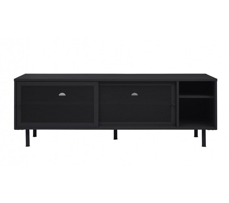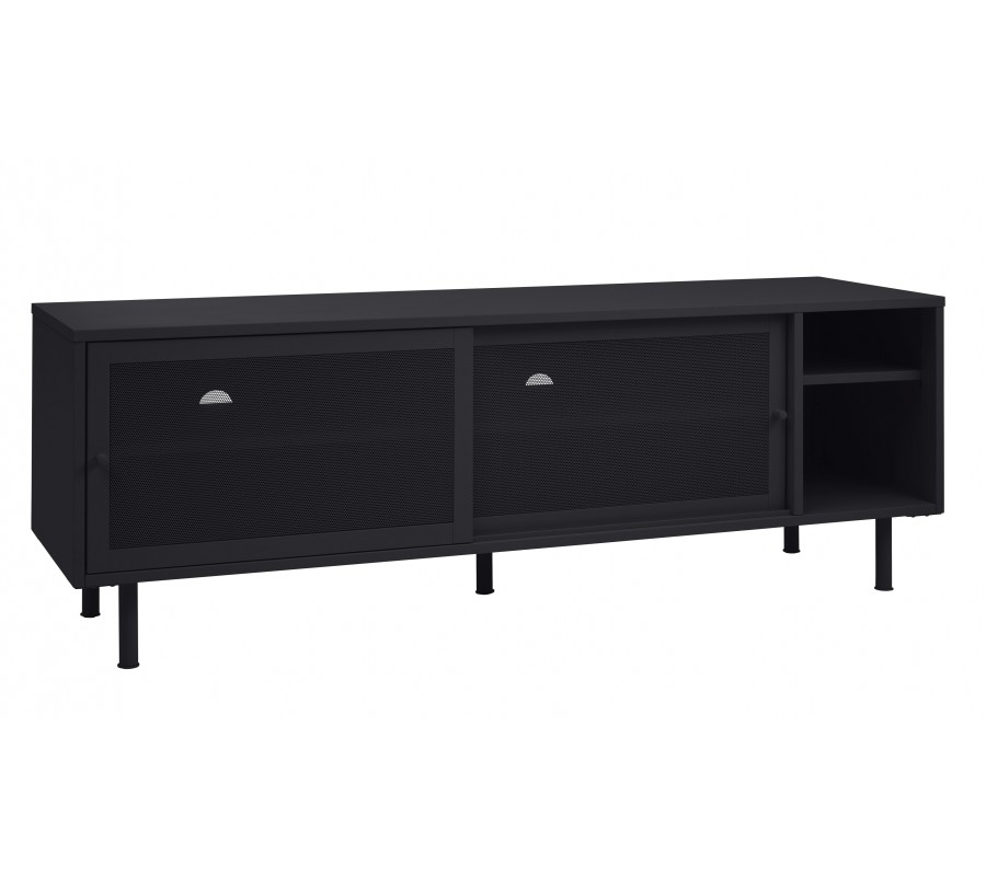 Industriální TV stolek Vejle z kovu v černé barvě s policemi a dvěma posuvnými perforovanými dvířky 160 cm