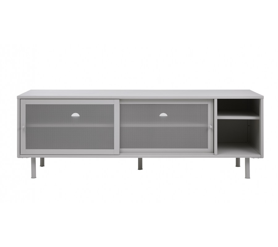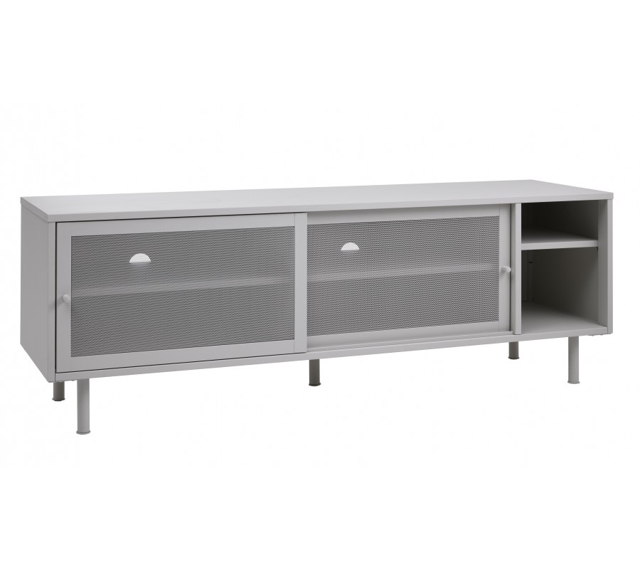 Moderní kovový TV stolek Vejle v šedobéžovém odstínu greige s perforovanými posuvnými dvířky a policemi 160 cm