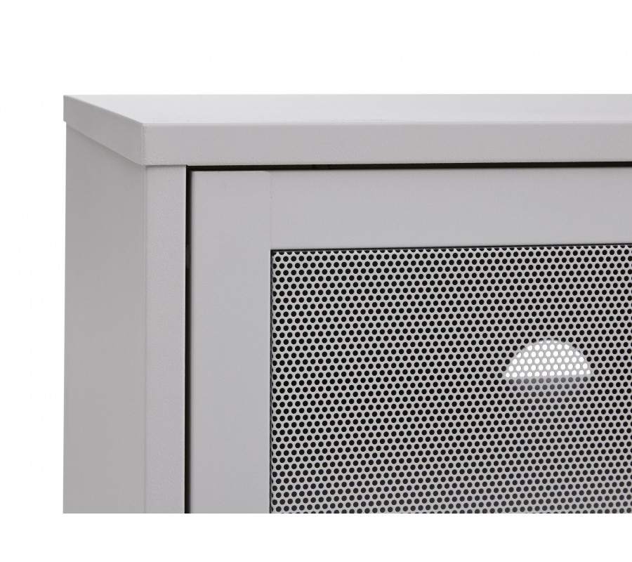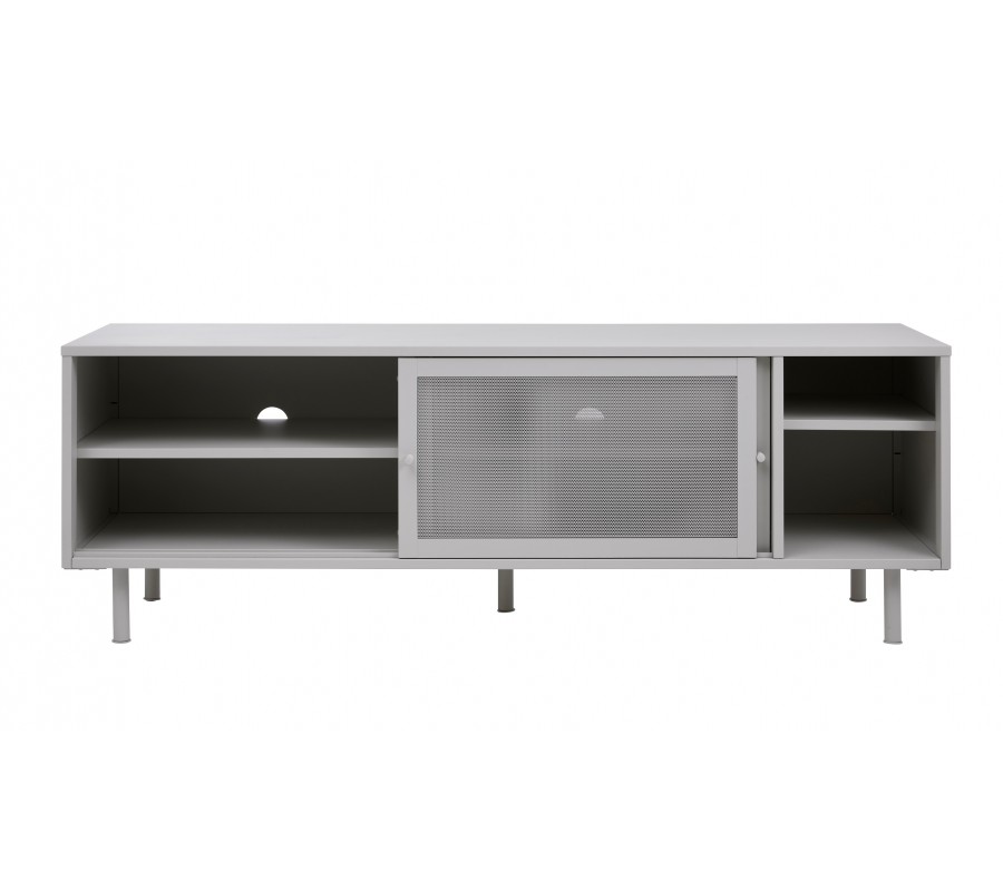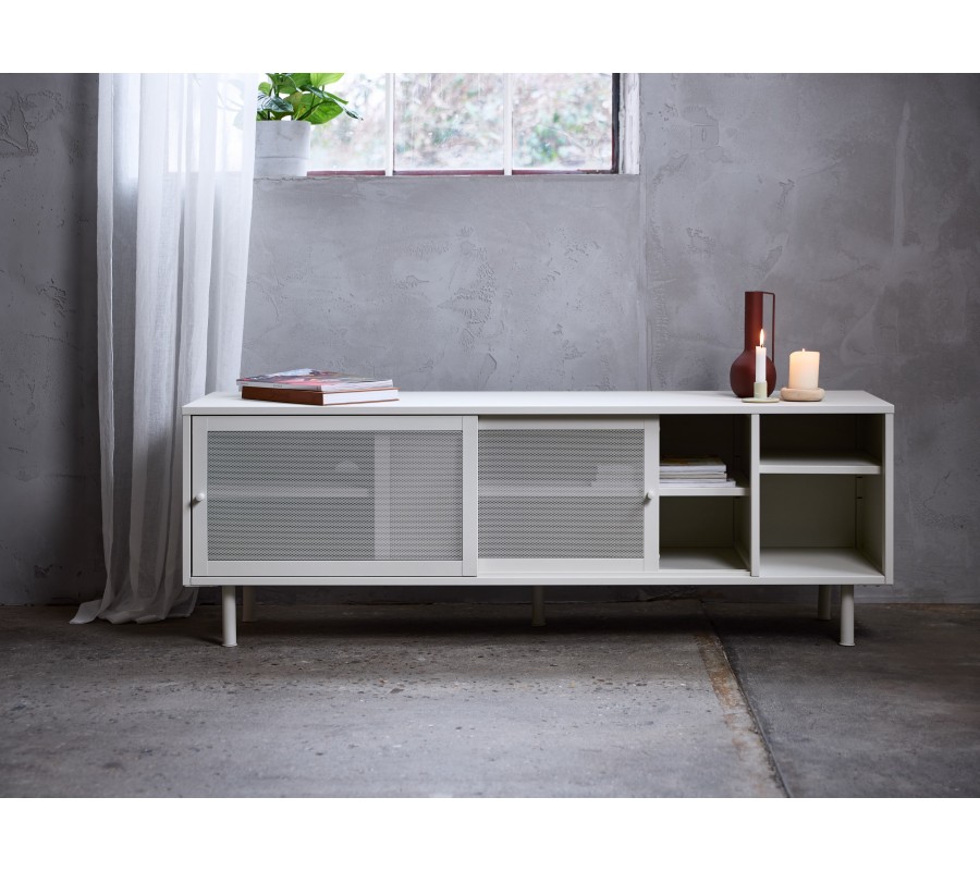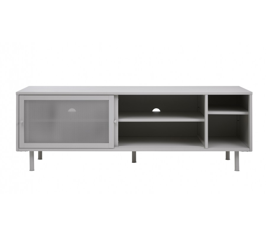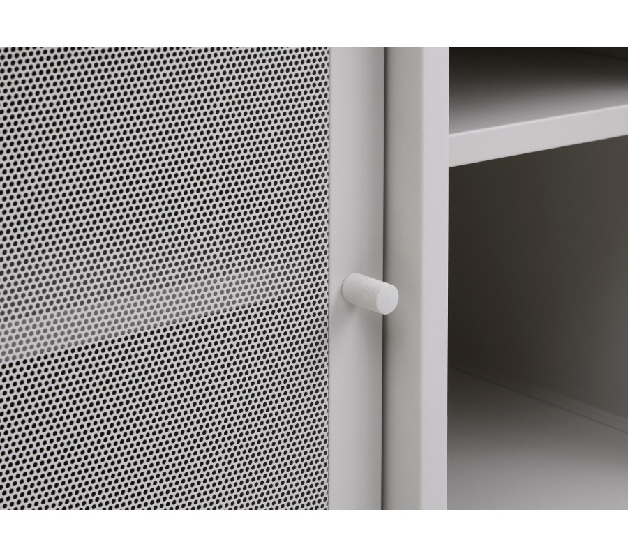 Televizní stolek Vejle je stylovým spojením moderního designu s nádechem industriální estetiky. Světlé provedení a perforované detaily působí vzdušně a snadno, přičemž oceníte i bohatý úložný prostor.