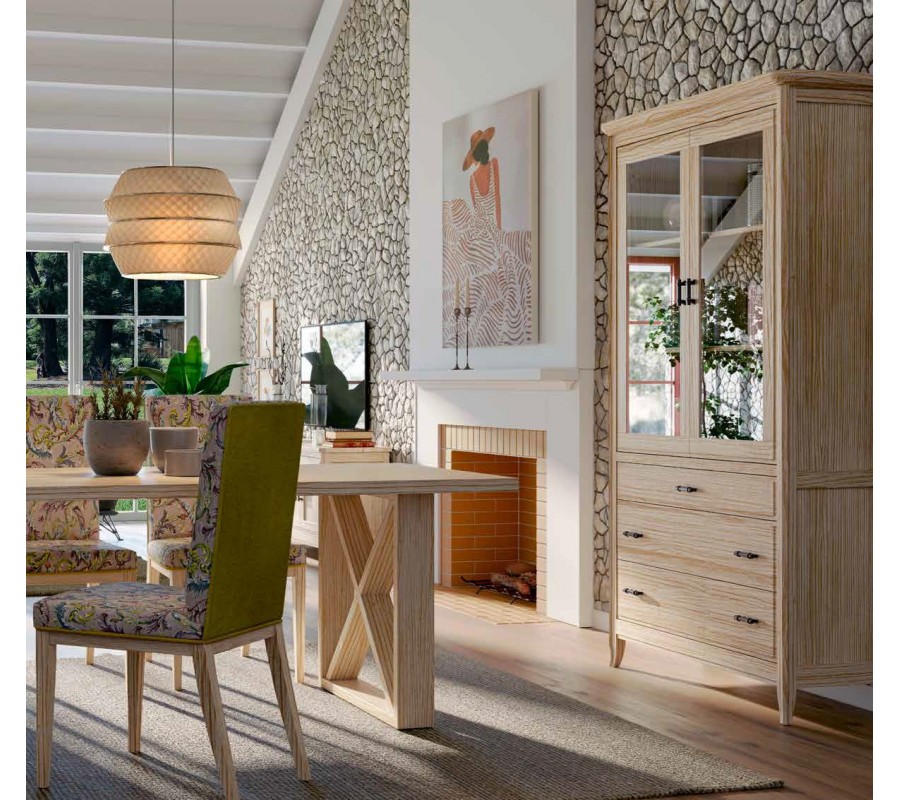 Luxusní vysoká dvoudveřová prosklená vitrína z masivu Genova v moderním provedení se třemi zásuvkami a kovovými rukojeťmi 202cm