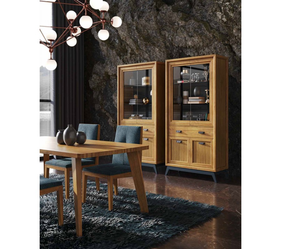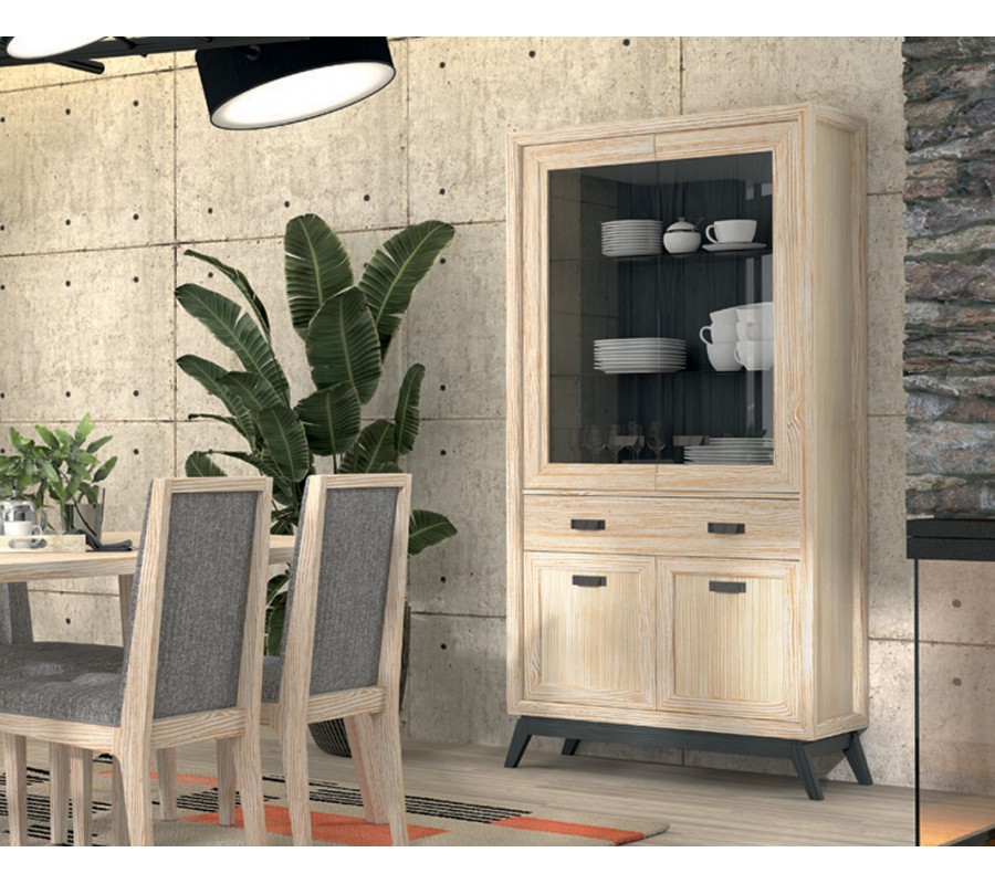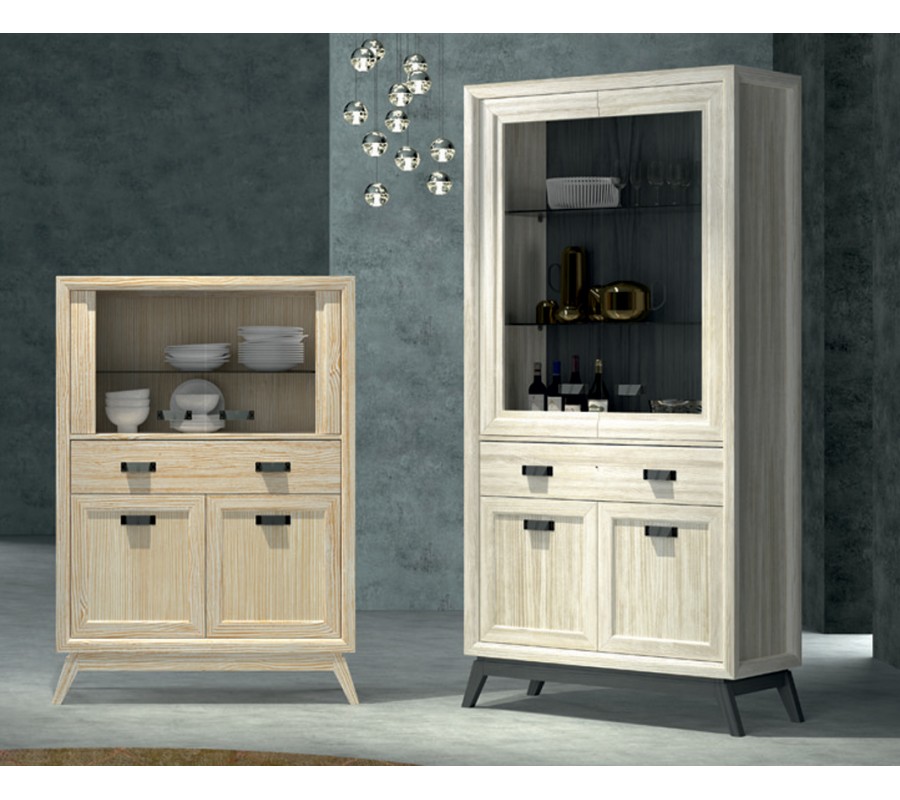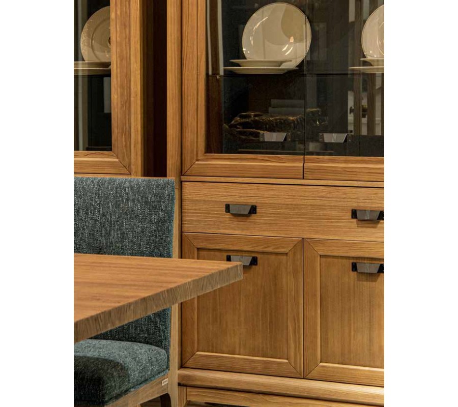 Vitrína má vysokou lineární siluetu a vyvýšenými hranami, které ještě zdůrazňují moderní geometrický tvar. Úložný prostor sestává z vyšší vrchní skříňky s prosklenými dvojitými dvířky a třemi policovými místy, která poskytuje ideální prostor pro vystavení porcelánu, křišťálu či dekorací. Pod ní se nachází široká zásuvka, vhodná pro menší předměty, jako například příbory či servírovací náčiní. Spodní dvojitá dvířka jsou dřevěná a zajistí diskrétní uzavřený úložný prostor. Úchytky jsou vyrobeny z kovu a mají minimalistický obdélníkový tvar. Podstavu tvoří obdélníkový rám, ze kterého vycházejí čtyři dynamicky zešikmené nožičky a přináší do designu dotek art deco stylu.