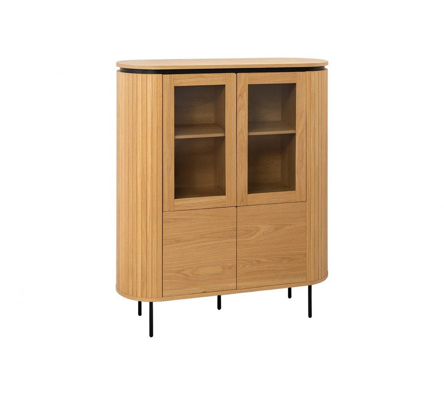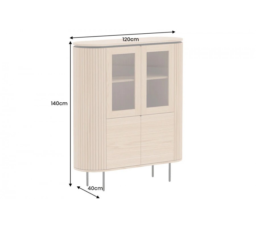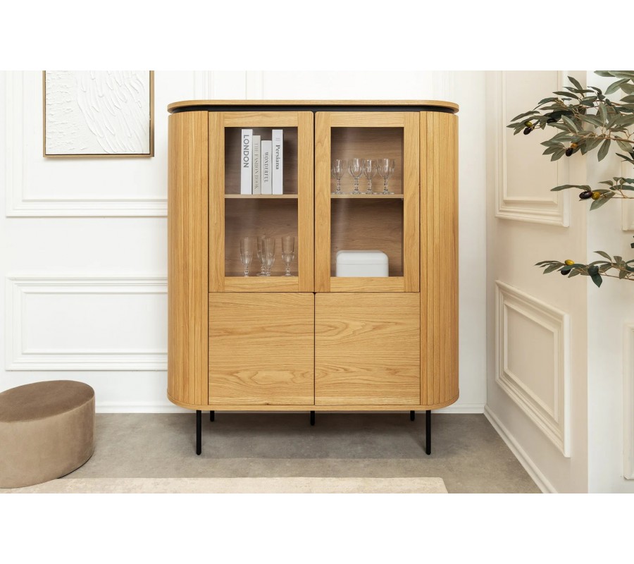 Barová skříňka má atypickou ovální siluetu a úložný prostor sestává z dvou dvoudveřových skříněk, umístěných nad sebou. Vrchní skříňka je uvnitř prodělená policí a má dvířka s průhlednou skleněnou výplní, takže ji můžete využít k vystavení reprezentativního nádobí z porcelánu či křišťálu, dekorací nebo knih. Spodní skříňka obsahuje vyšší úložný prostor s jedním policovým místem. Plná hladká dvířka poskytnou diskrétní odkládací místo na dokumenty, textilie či osobní předměty. Design bez úchytek působí moderním dojmem.