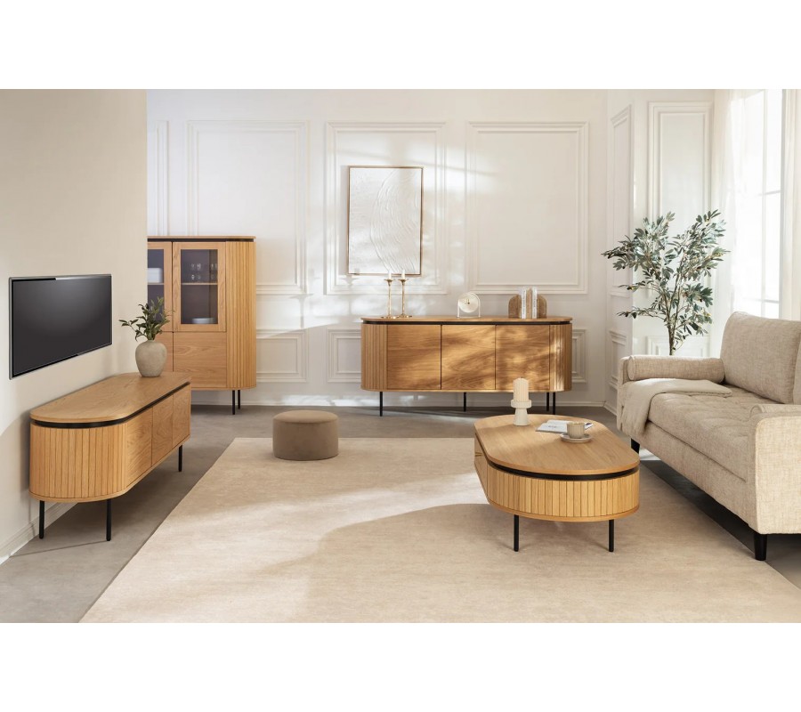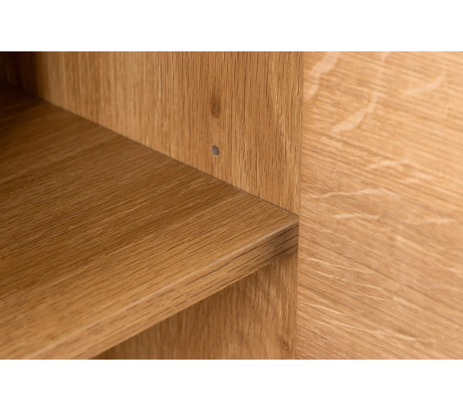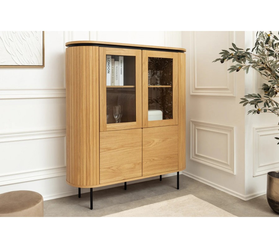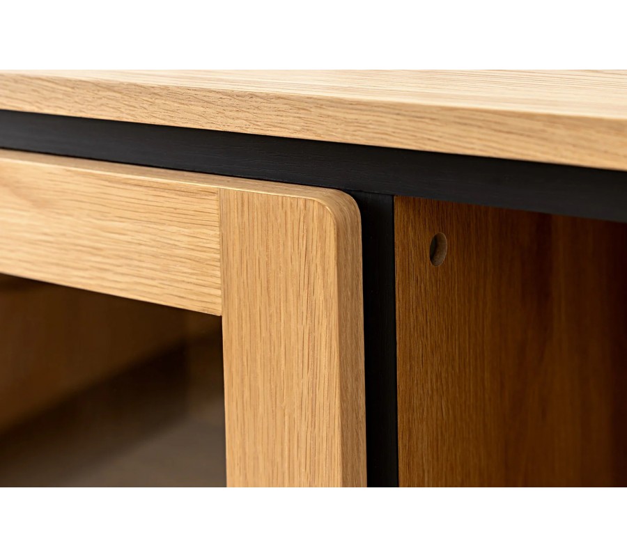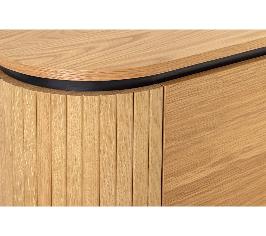 Na stranách zdobí skříňku vertikální lamelový reliéf, inspirovaný dekorativními prvky v art deco stylu. Pět nožek je vyrobeno z kovu. Mají štíhlý válcovitý tvar, který vizuálně odlehčuje mohutný úložný prostor. Provedení v matné černé barvě se propojí se zúženou lištou nad vrchními dvířky s černým lakováním a vytvoří tak kontrastní minimalistický akcent. Skříňka je vyrobena z dubové dýhy, která jí propůjčuje naturální světlou hnědou barvu s pravidelnou kresbou letokruhů.