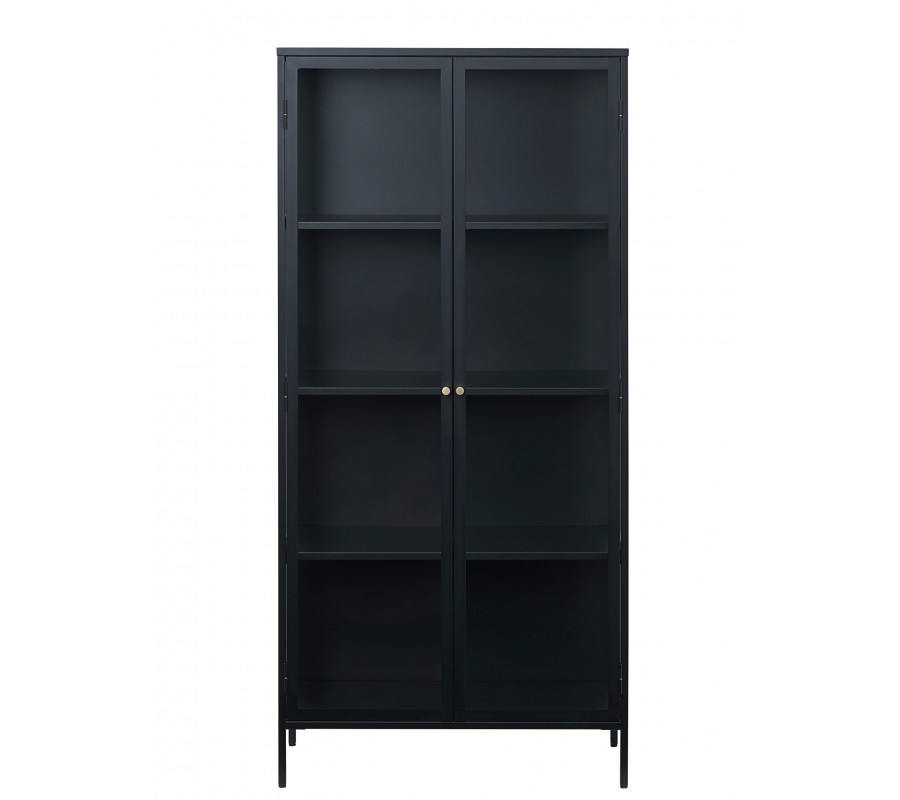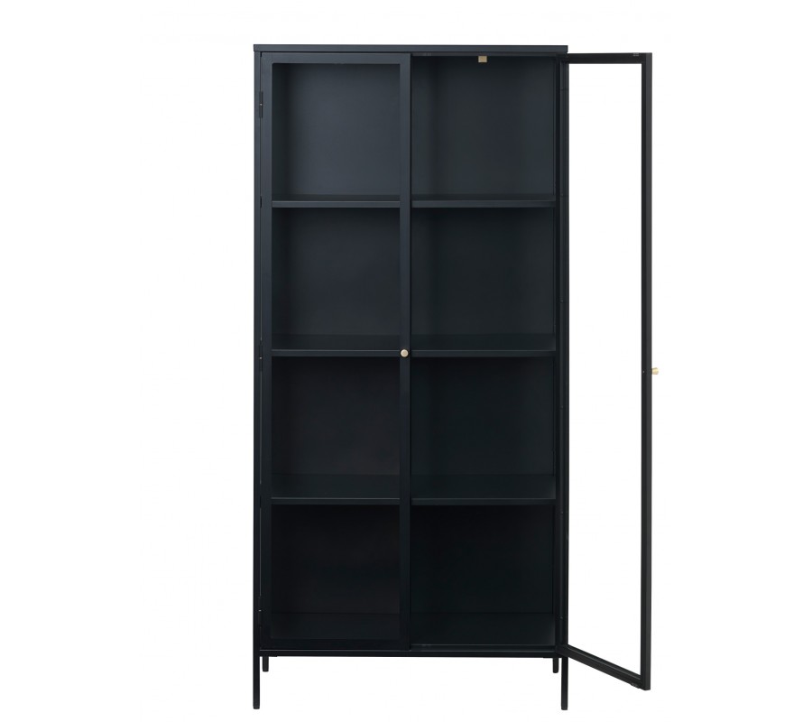 Konstrukce vitríny je vyrobena z kovu v matném černém provedení, které jí dodává charakteristický industriální vzhled. Design doplňují elegantní zlaté kulaté úchytky a drobné detaily na pantech dvířek. Výplně z bezpečnostního skla jsou pevné a spolu s tenkými liniemi rámu vytvářejí vzdušný a lehký vizuální efekt.
