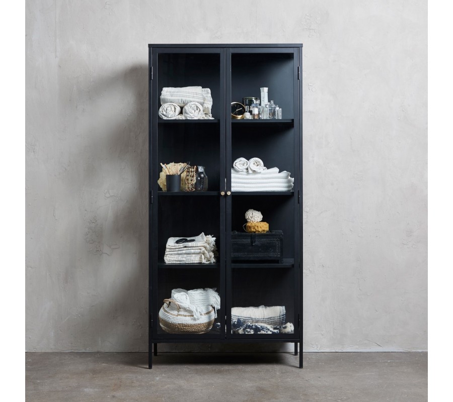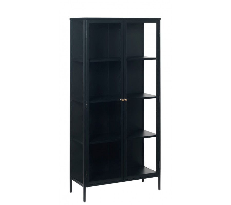 Industriální vysoká prosklená dvoudveřová vitrína Soeren se čtyřmi policovými místy z kovu v černé barvě 190 cm