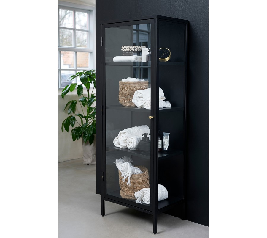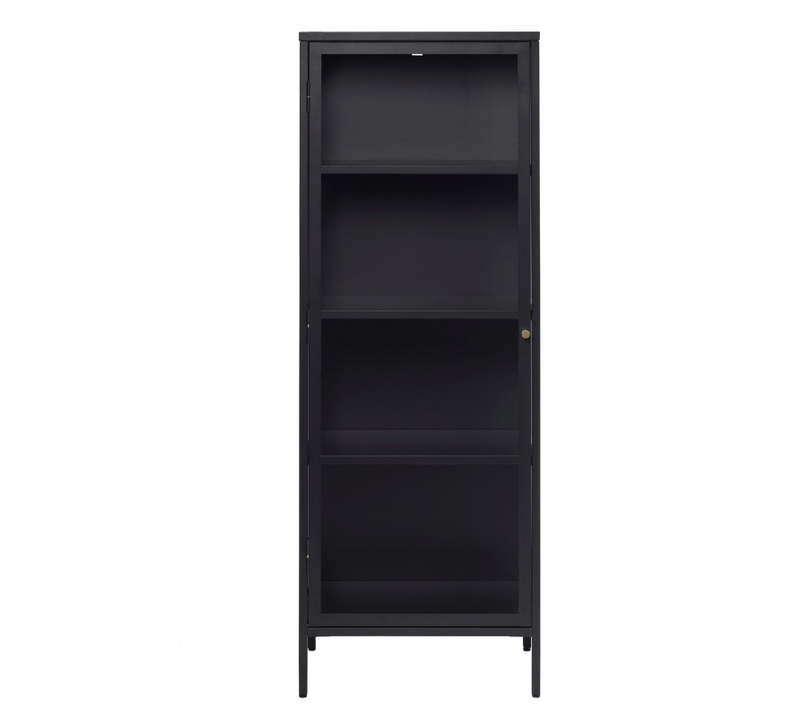 Vitrína je vyrobena zkovu v matném černém provedení, který jí dodává industriální výraz. Elegantní akcent vytvářejí zlaté kulaté úchyty a detaily na pantech dvířek. Výplně z bezpečnostního skla jsou pevné a v kombinaci se štíhlými liniemi rámu působí snadno a vzdušně.
