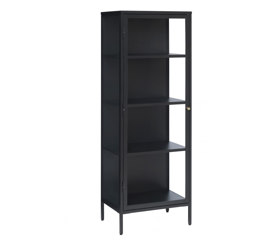 Industriální moderní vitrína Soeren s prosklenými dvířky z kovu v černé barvě se čtyřmi policemi 160 cm