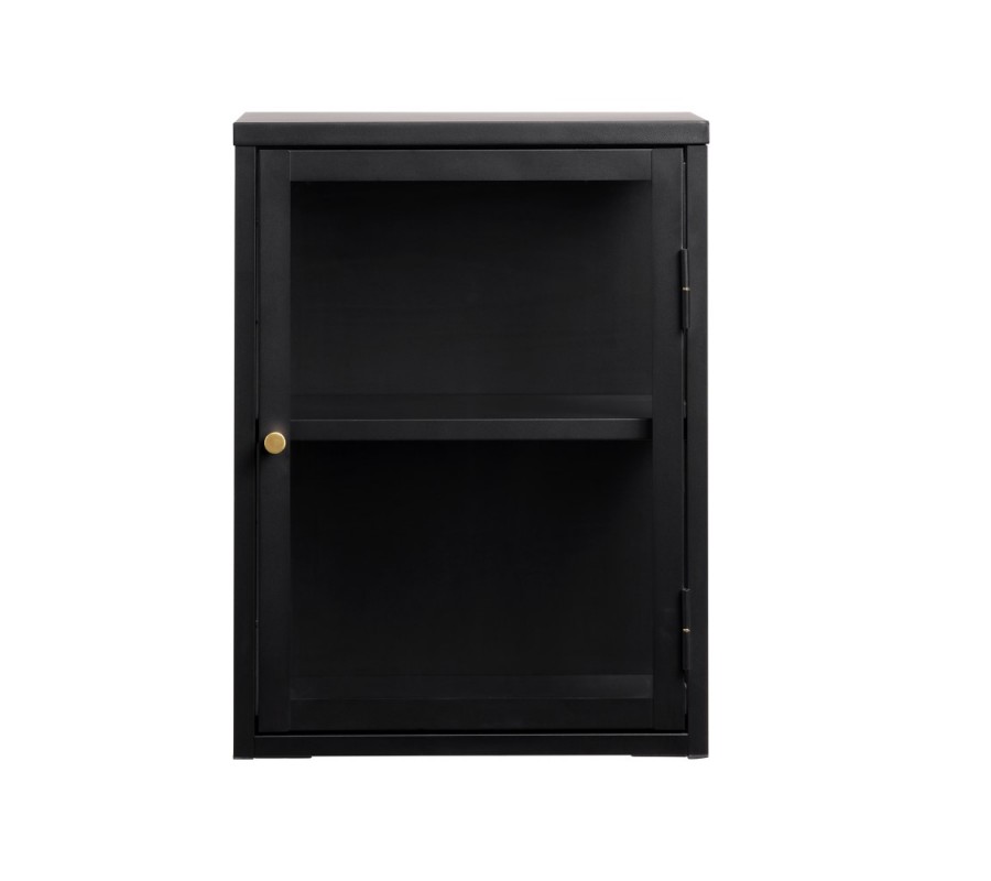 Designová industriální nástěnná vitrína Soeren s jedněmi dvířky z kovu v černé barvě se skleněnými výplněmi 60 cm