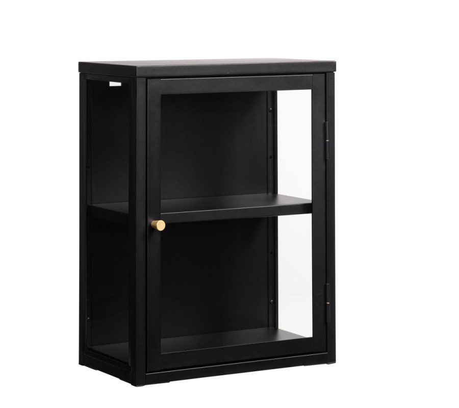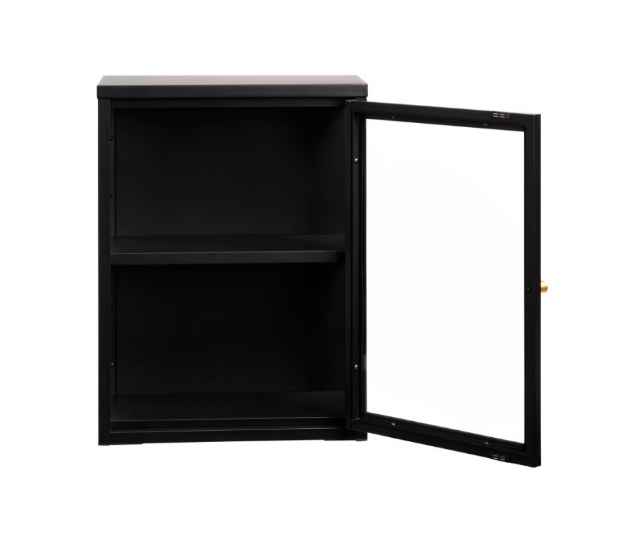 Vitrína má obdélníkový půdorys a pevnou kovovou konstrukci. Zadní strana je plná, zatímco boční strany a přední dvířka jsou osazeny průhlednou výplní z bezpečnostního skla. Rám je hladký, což působí moderním dojmem. Interiér je předělen jednou příčkou a poskytuje tak dvě stejně velká policová místa. Dvířka doplňuje kulatá úchytka v lesklém zlatém provedení. Vytváří kontrast k černé barvě a dodává nábytku elegantní prvek.