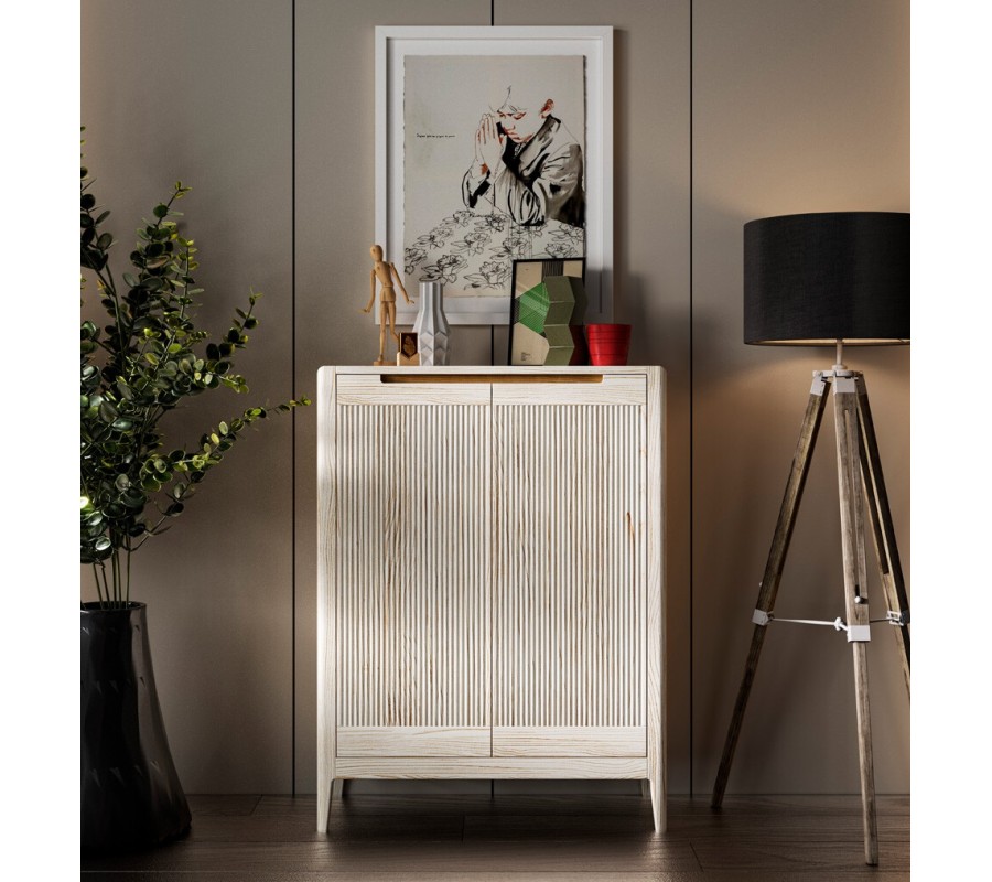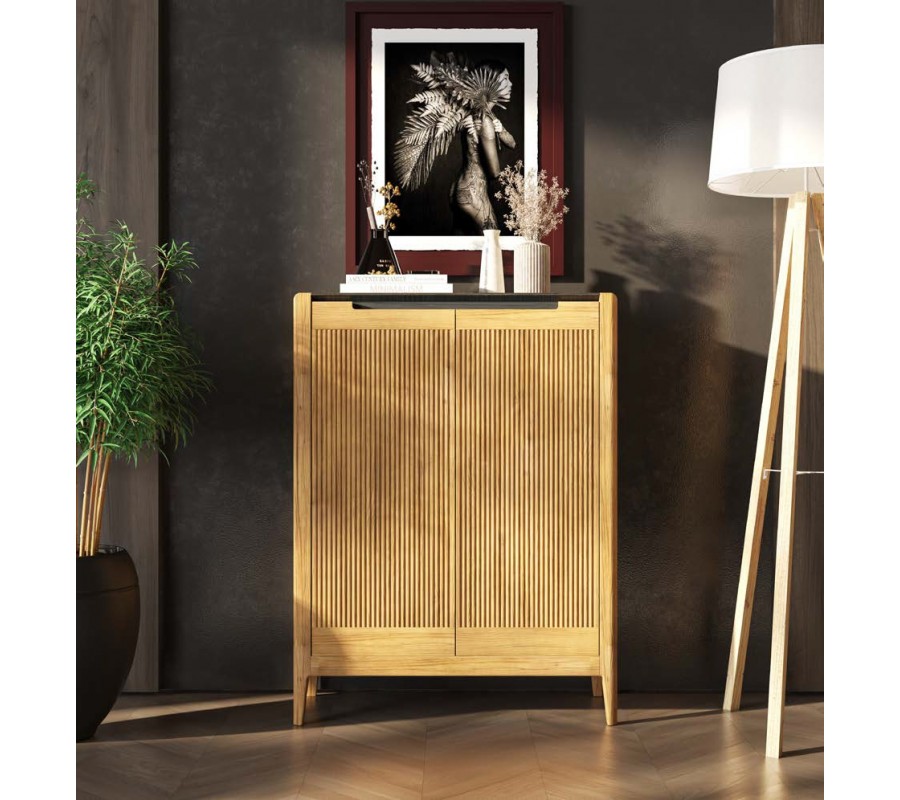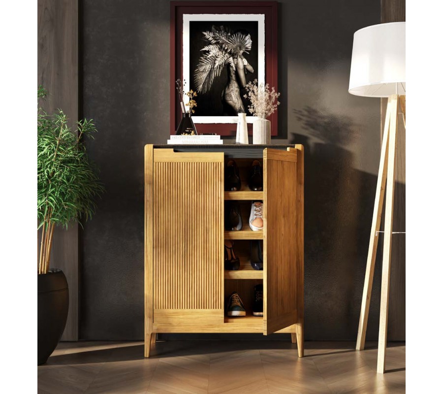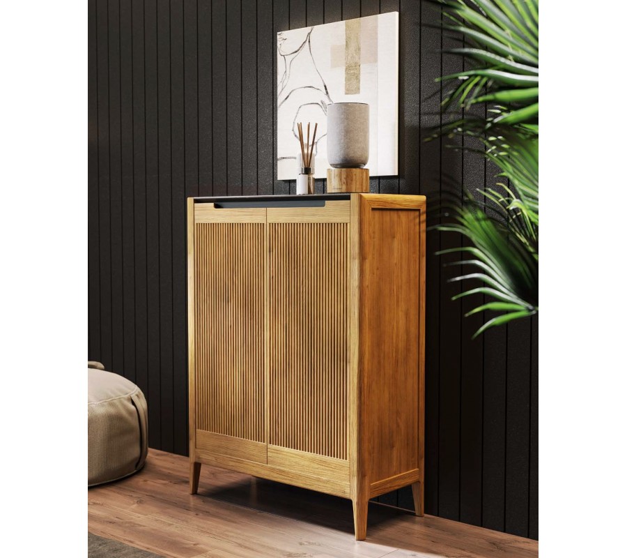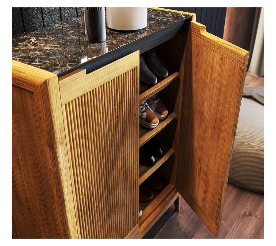 Botník má dvoudveřové řešení s vnitřním systémem tří nakloněných polic, které umožňují přehledné uložení obuvi a efektivní využití prostoru. Přední plochy dvířek jsou zpracovány vertikálním vroubkováním, které vytváří jemnou rytmiku a dekorativní strukturu. Otevírání je řešeno integrovanými vyříznutými úchyty v horní části dvířek, díky čemuž zůstává design čistý a nerušený.