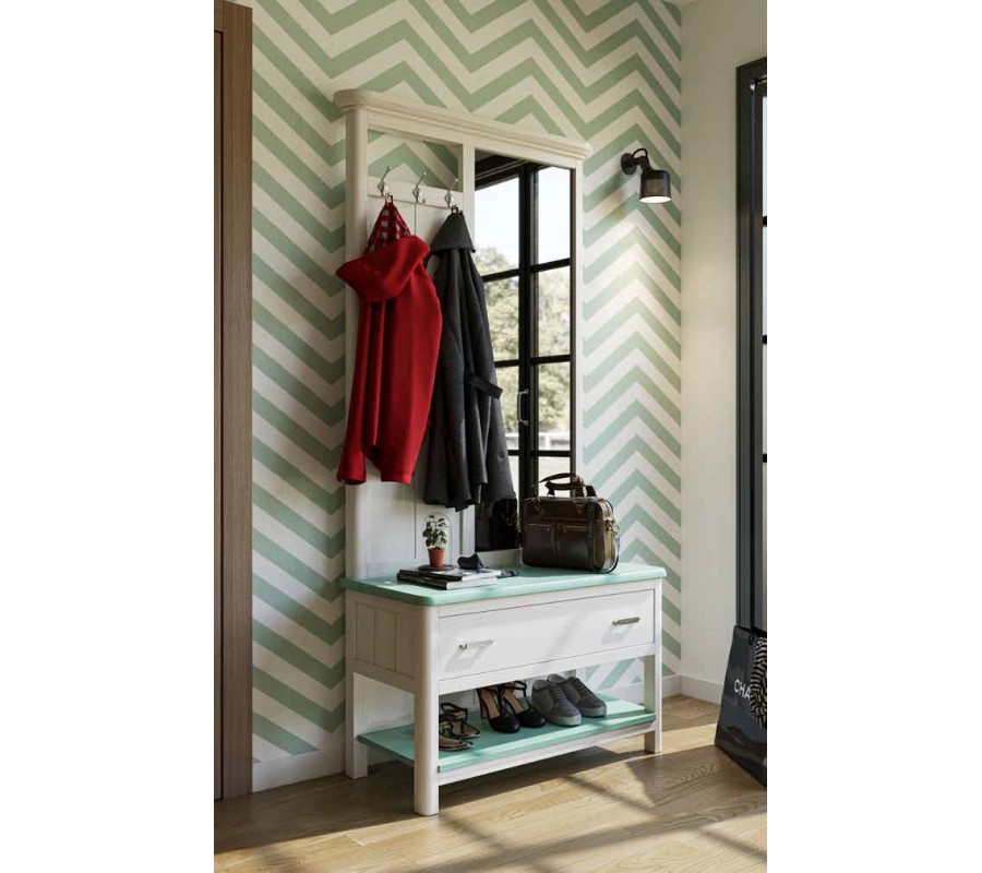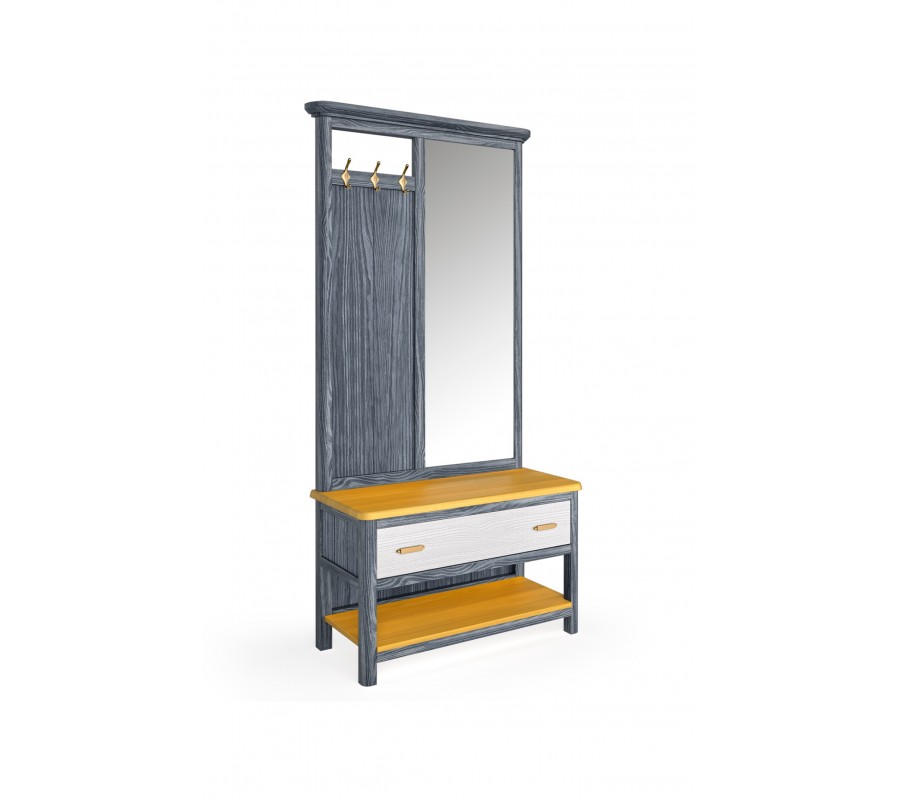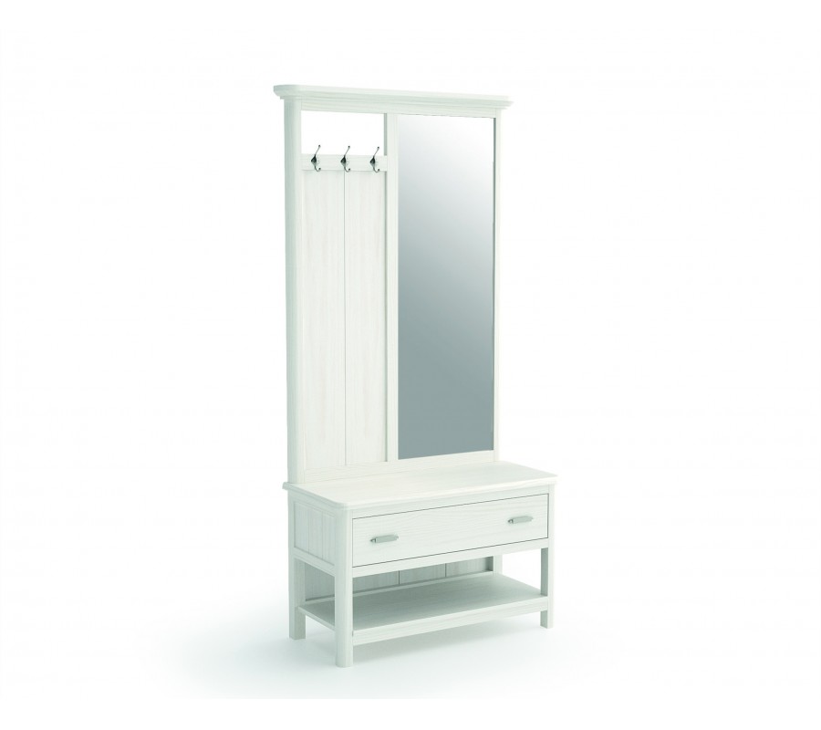 Nad lavicí se do výšky tyčí obdélníkový rám, ukončený ve vrchní části dekorativní lištou s vrstveným reliéfem a zaoblenými okraji, která působí tradičním venkovským dojmem. Pravou stranu zabírá velká zrcadlová plocha, zatímco levá má dřevěnou výplň. V její vrchní části je menší obdélníkový otvor a pod ním jsou umístěny tři kovové věšáky na kabáty a doplňky.