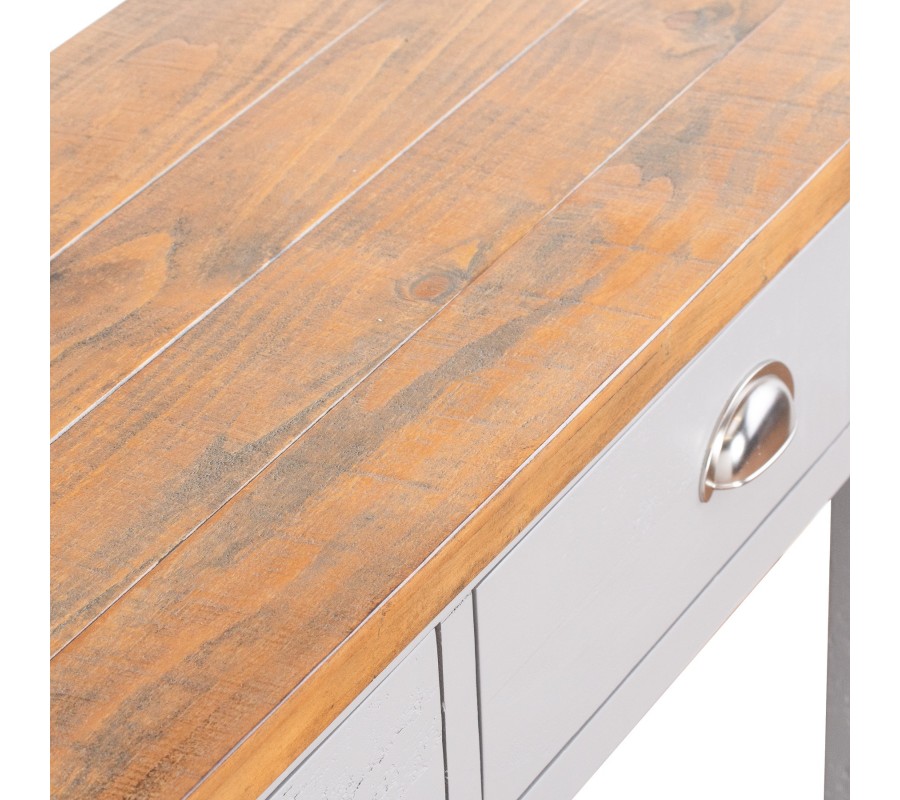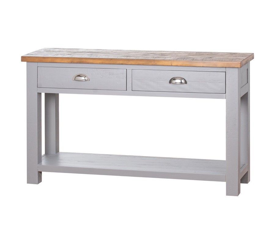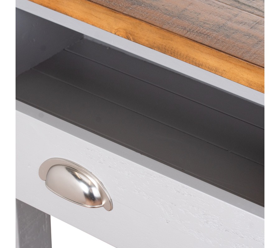 Designová konzola z naší jedinečné kolekce Byland Vás jednoznačně svým autentickým vzhledem. Konzolový stolek je vyroben z kvalitního masivního dřeva, které bylo ruční prací přetvořeny do tohoto jedinečného kousku. Stolek se skládá ze dvou prostorných zásuvek, zajišťují tak dostatek úložného prostoru, nacházejících se pod vrchní deskou, která si díky speciální povrchové úpravě zachovala svou jedinečnou přírodní strukturu a také z prostorné poličky nacházející se ve spodní části konzoly. Celkový design stolku je doplněn kovovými úchytkami stříbrné barvy umístěnými uprostřed čel zásuvek. Konzola se bude zaručeně skvěle vyjímat ve Vaší předsíni v kombinaci s nástěnným zrcadlem a dekoracemi ve stříbrné barvě.