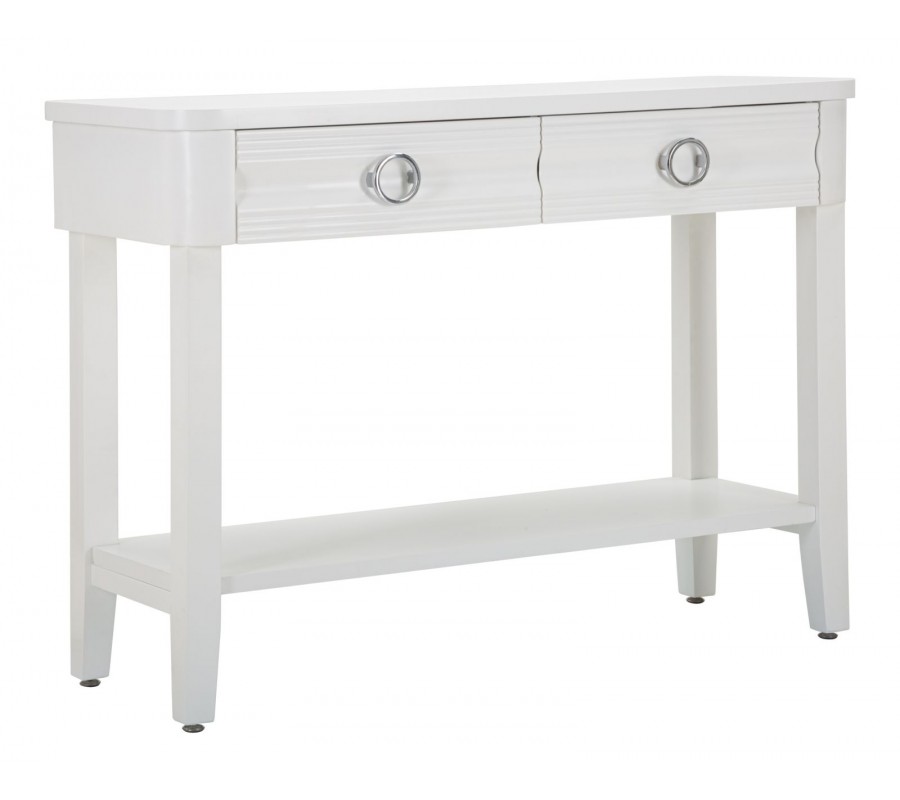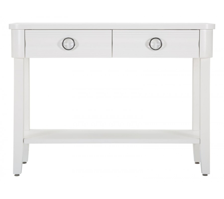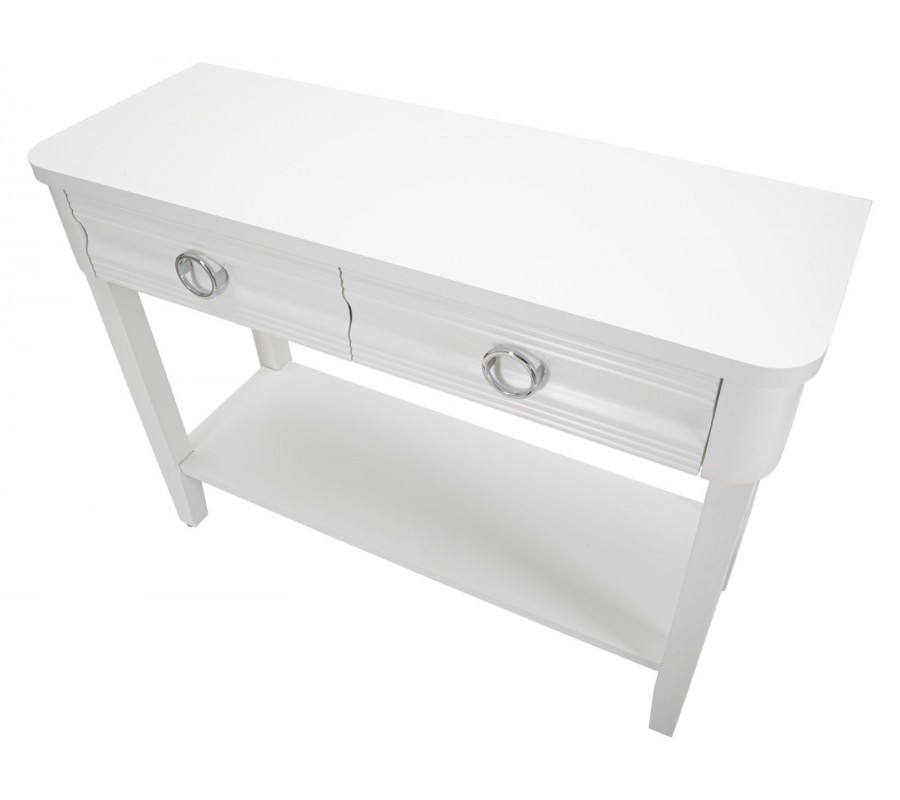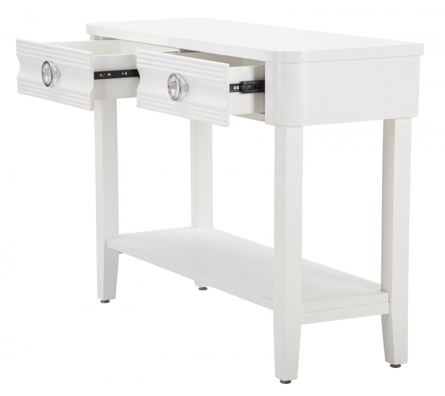 Konzolový stolek má obdélníkový tvar se zaoblenými předními rohy. Pod vrchní deskou jsou vedle sebe umístěny dvě zásuvky, které poskytují praktický úložný prostor pro důležité drobnosti. Stolek je postaven na čtyř hranatých nohách. Jejich silueta je jemně prohnutá, což výborně koresponduje se zaoblenými rohy vrchní části a přináší do designu půvabný nádech venkovského stylu. V podobném duchu se nese i přední strana zásuvek, která je také mírně prohnutá a ve vrchní a spodní části ji zdobí lineární reliéf. Ve spodní třetině nožiček je umístěna velká police, která zajišťuje dodatečné odkládací místo.