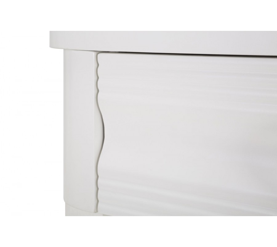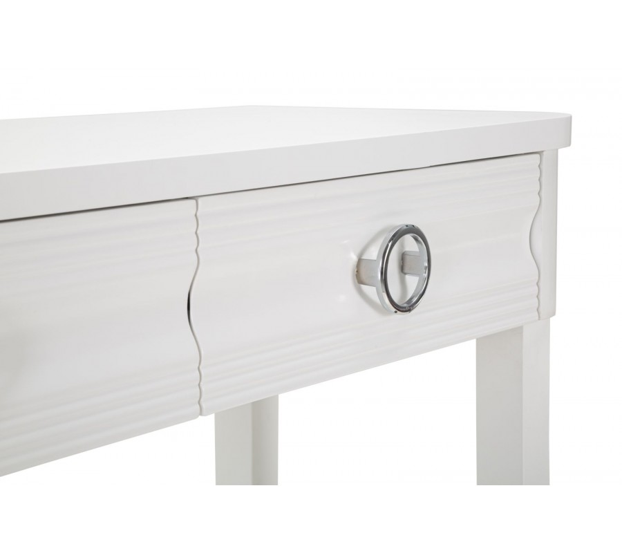 Stolek je vyroben z kombinace masivního a dýhovaného dřeva. Povrch pokrývá výrazně lesklý bílý nátěr, který ve spojení s chromovými kovovými detaily dodává nábytku moderní rozměr. Chromové prvky jsou minimalistické, v podobě kulatých kluzáků na spodku nožiček a úchytek ve tvaru kruhu na zásuvkách.