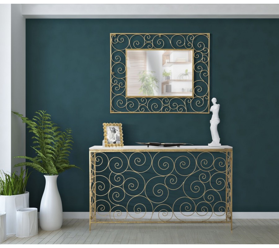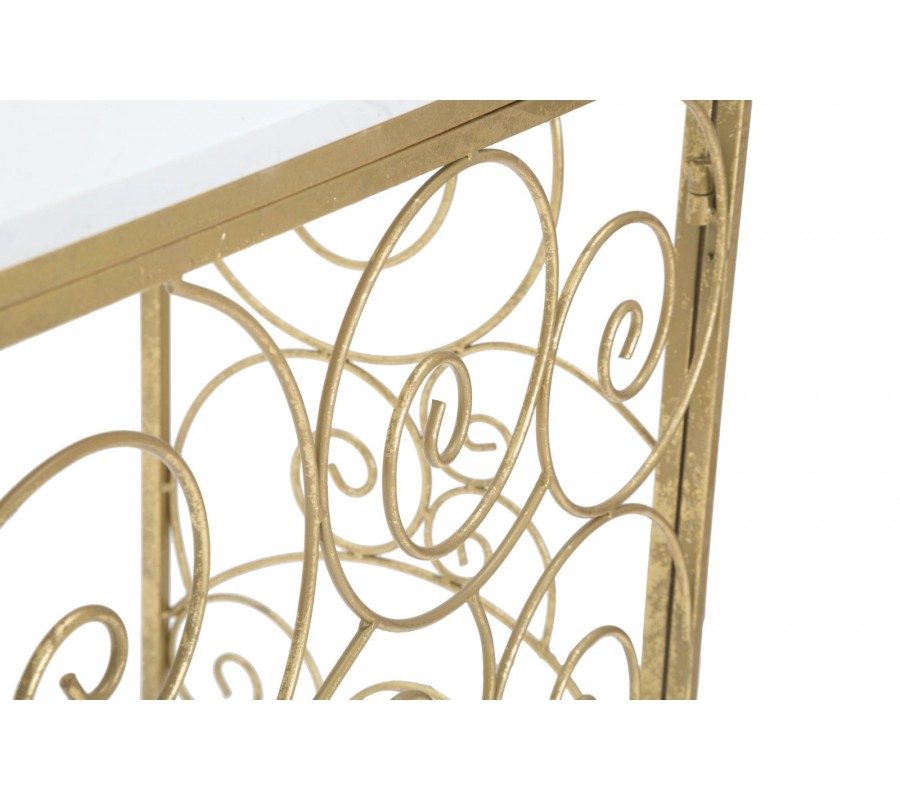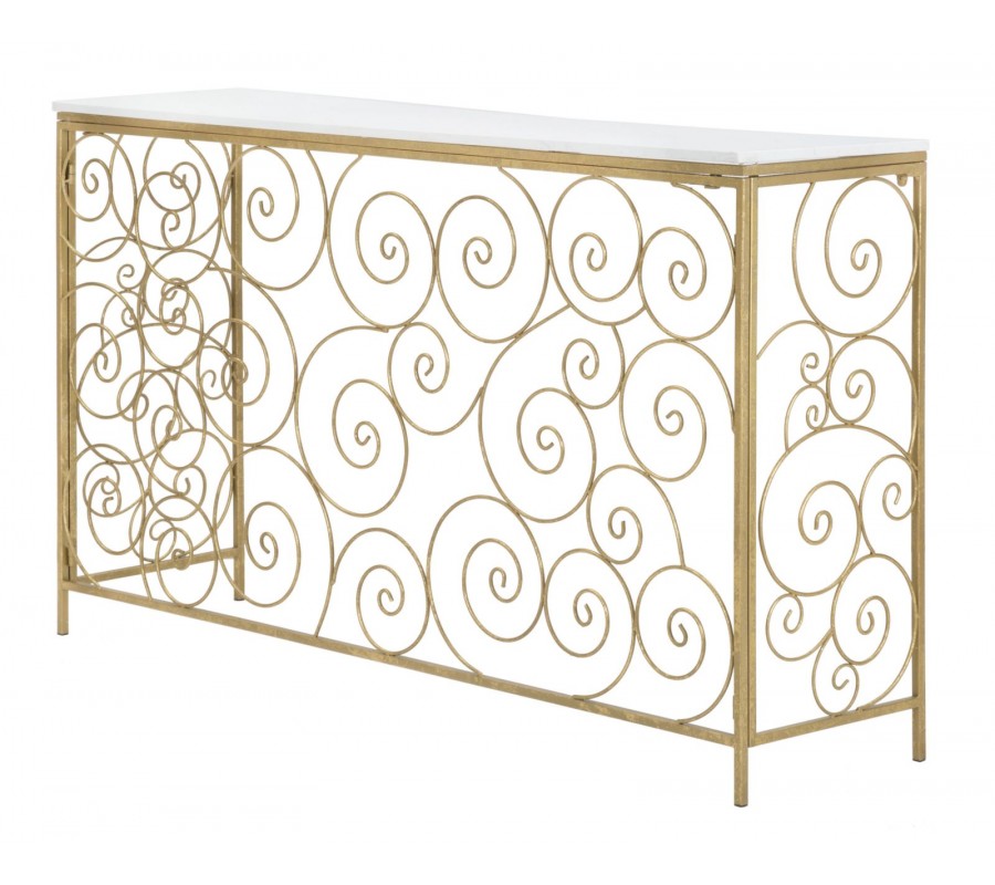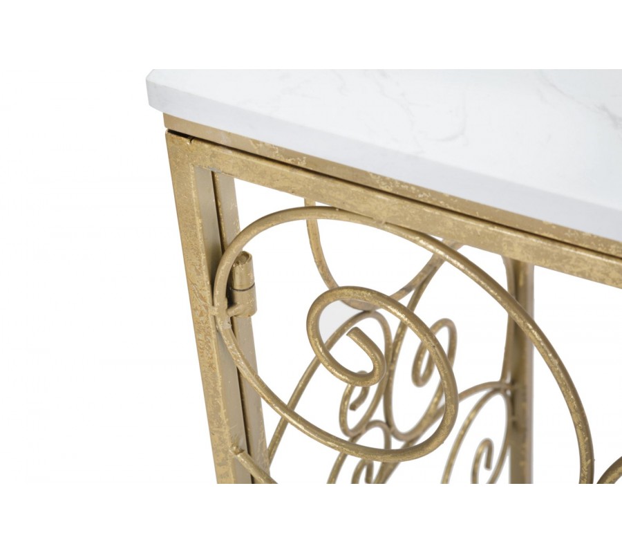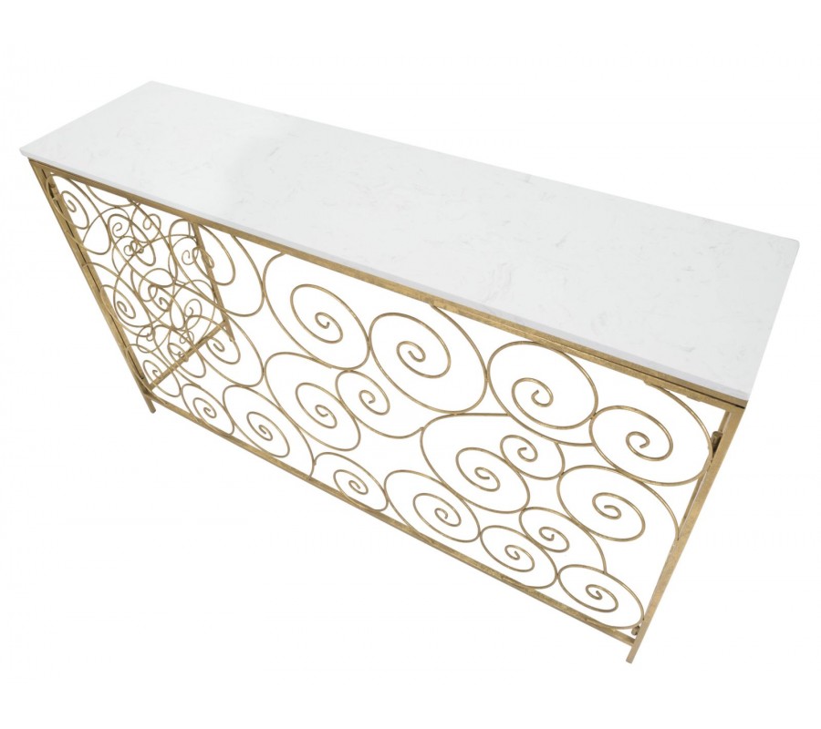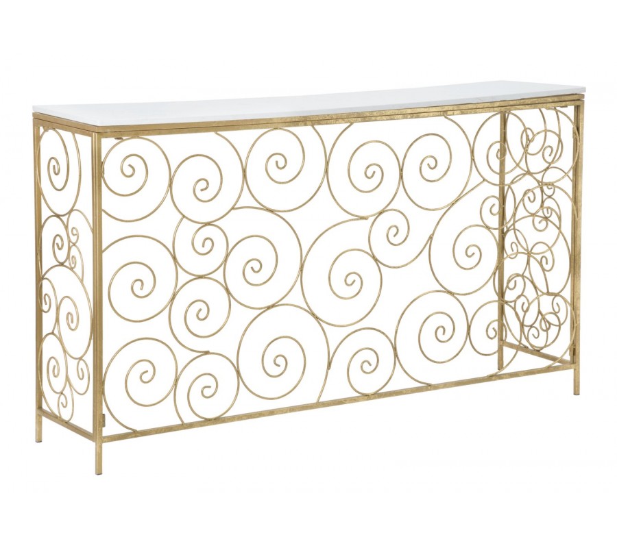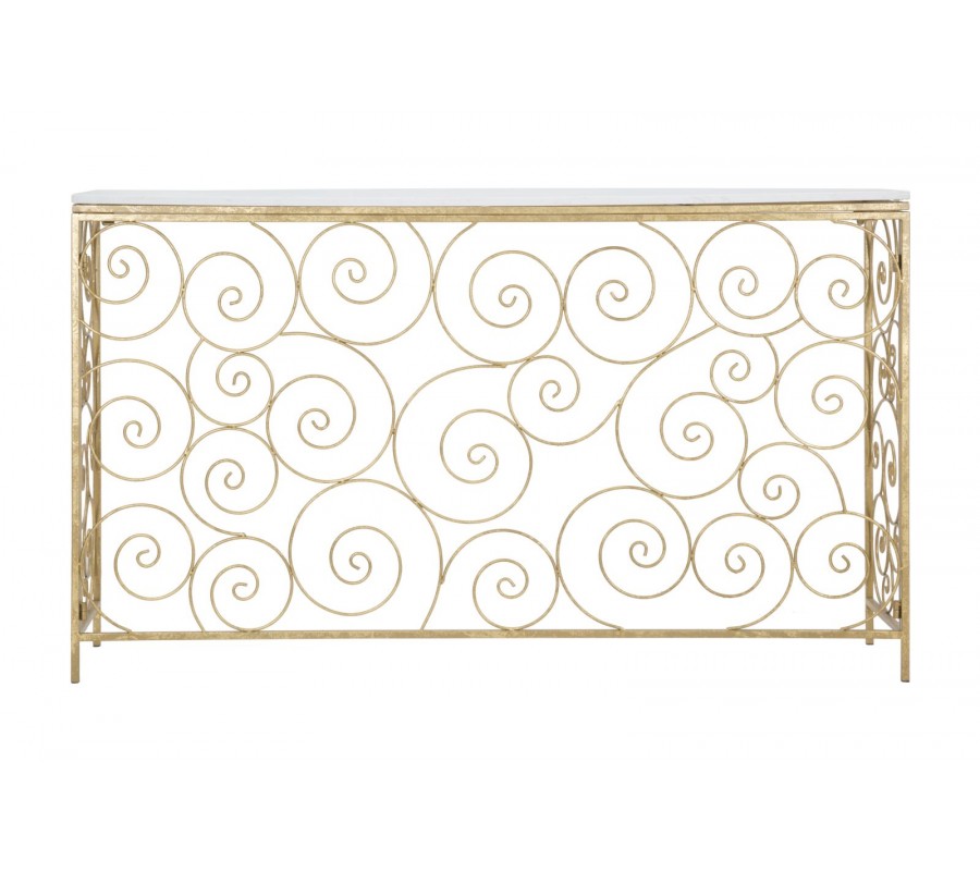 Designový glamour konzolový stolek Giard s bílou mramorovou deskou a zlatou konstrukcí s motivem spirál 140 cm