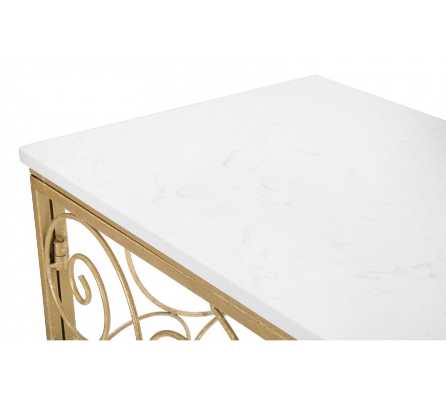 Konzolový stolek má úzký a obdélníkový tvar, díky čemuž je ideální do předsíně, obývacího pokoje nebo prostoru za pohovkou. Precizně vypracovaná konstrukce mu dodávají ladnost a vizuální lehkost. Kombinace bílé a zlaté je typická pro glamour styl. Vrchní deska s mramorovým designem v bílé barvě přináší sofistikovanost a čistotu.