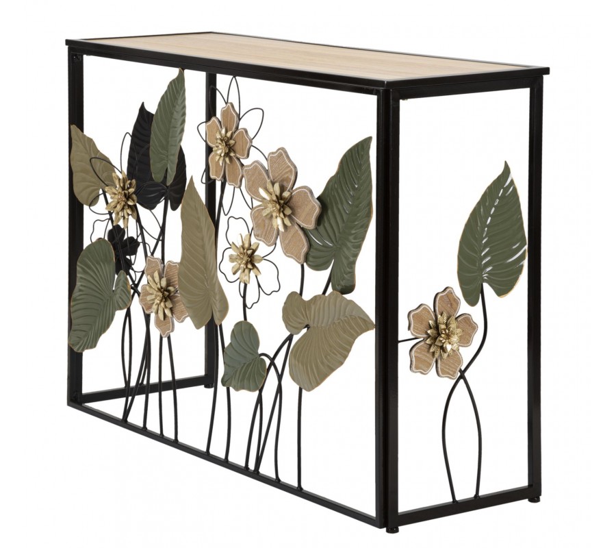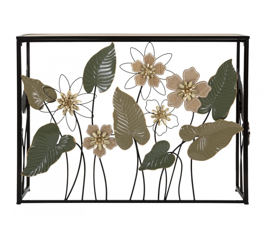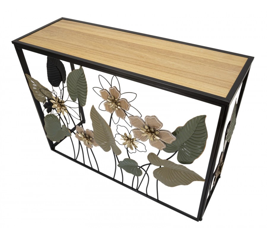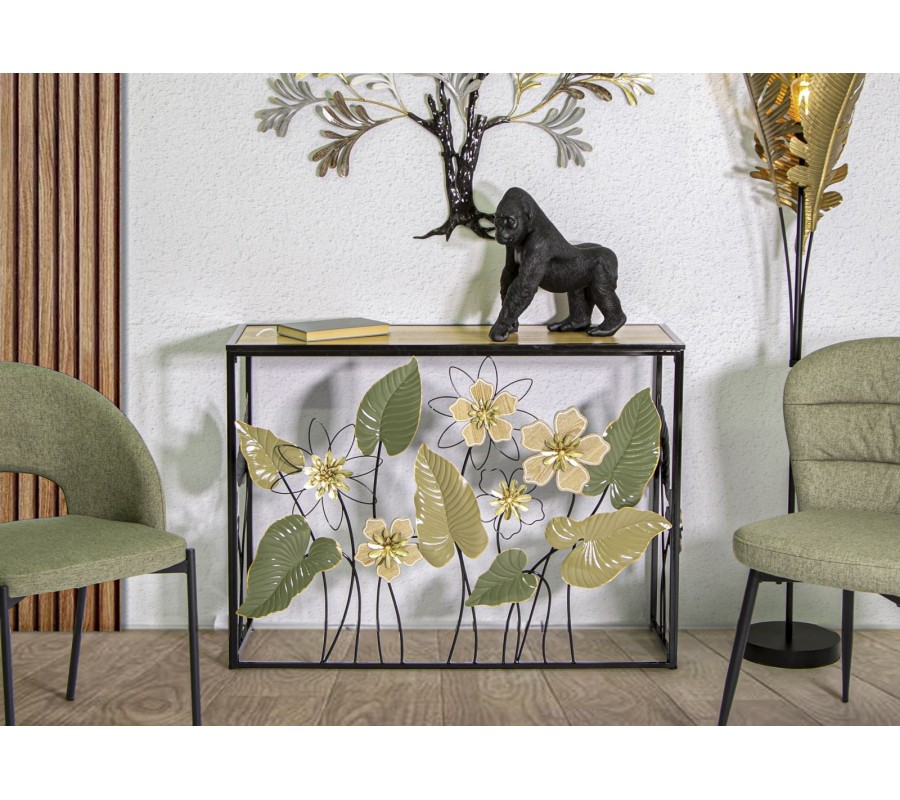 Glamour obdélníkový kovový konzolový stolek Florel s dřevěnou deskou a florálním motivem ve zlaté a zelené barvě 108 cm