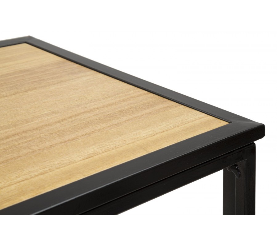 Vrchní deska je vyrobena ze dřeva a má jemně strukturovaný povrch, který zvýrazňuje přirozenou kresbu materiálu. Světlý hnědý odstín dřeva vytváří elegantní kontrast s tmavým kovovým rámem, čímž podtrhuje sofistikovaný vzhled stolku.