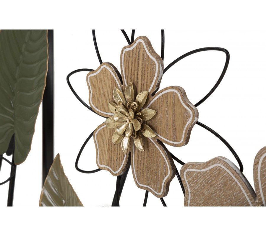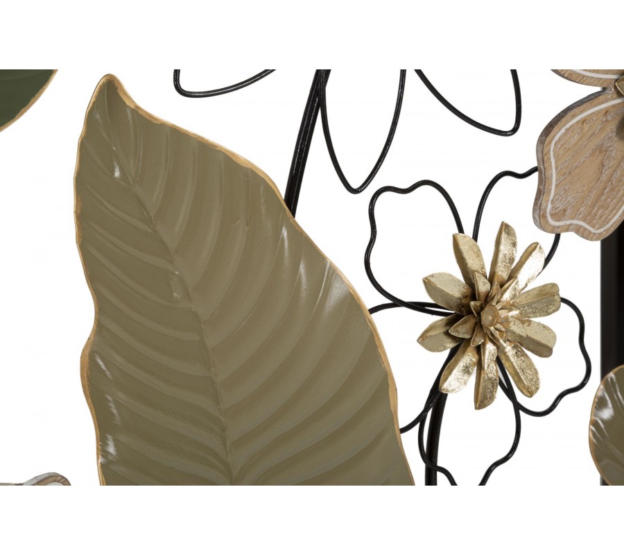 Nejvýraznějším prvkem je působivý florální motiv umístěný na přední a bočních stranách konstrukce. Kovové květy v odstínech zlaté a béžové s jemnými texturovanými detaily jsou doplněny o listy v zelené barvě, které působí dynamicky díky jemně zvlněným hranám.