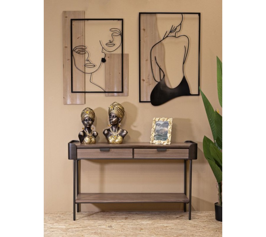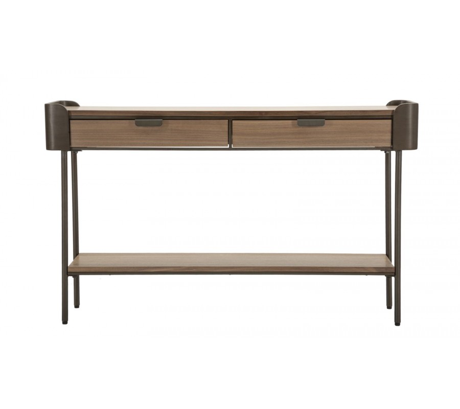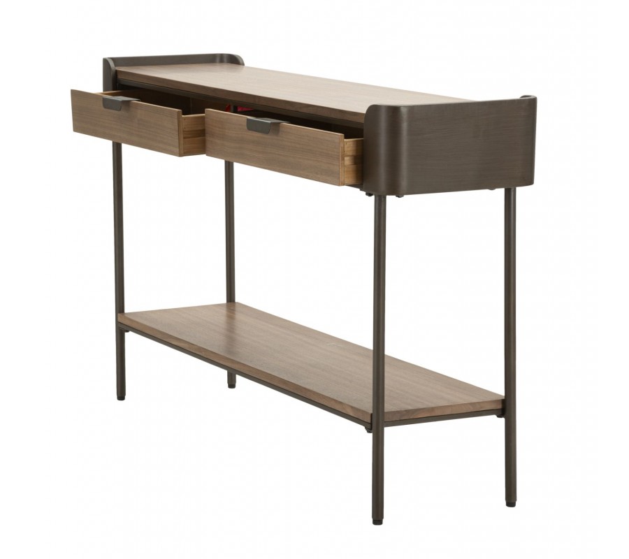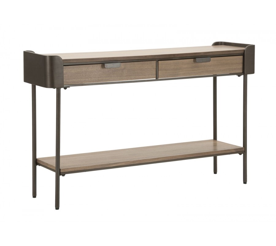 Industriální obdélníkový hnědý konzolový stolek Lavient s kovovou hnědou konstrukcí a dvěma zásuvkami s poličkou 120 cm