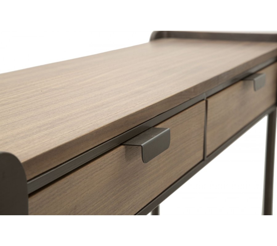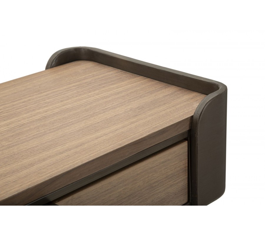 Design stolku je definován oblými rohy, které zjemňují jeho celkový vzhled a dodávají mu elegantní nádech. Dve zásuvky poskytujú praktický úložný priestor a sú doplnené kovovými úchytkami, ktoré harmonizujú s tenkou kovovou konštrukciou v tmavom prevedení. Vyvýšené kovové boky na vrchní desce přidávají stylový detail a zároveň chrání předměty před sklouznutím.