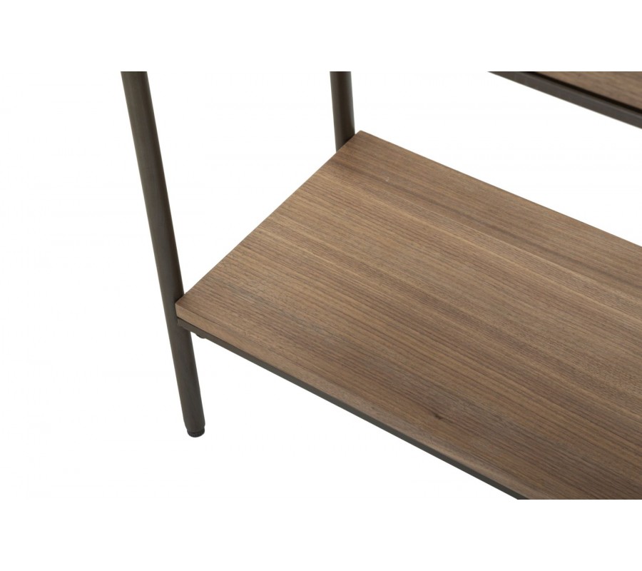 Obdélníkový konzolový stolek Lavient v industriálním stylu. Vrchní deska a police jsou vyrobeny z hnědého masivního dřeva s výrazný.