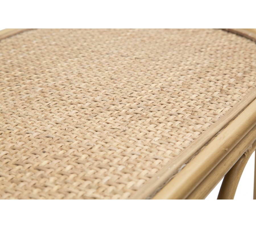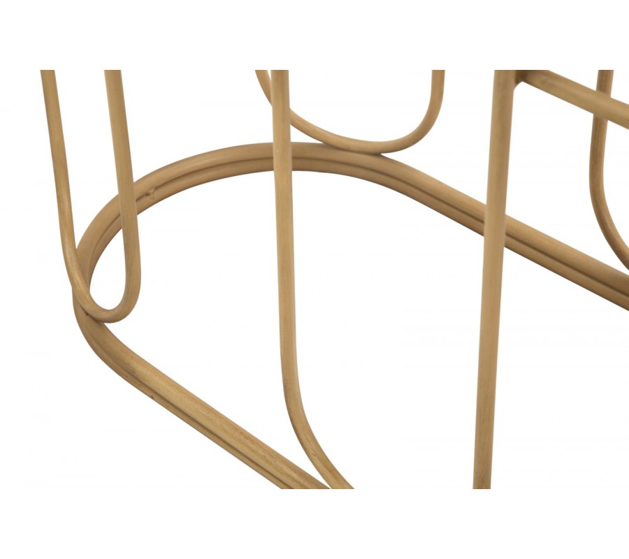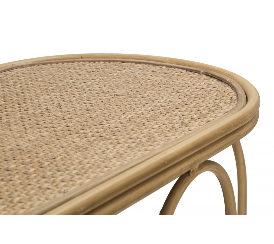 Vrchní deska má zaoblený tvar a na povrchu je zdobená ratanovým výpletem, který vytváří jemnou texturu a zdůrazňuje přírodní charakter materiálu. Výplet je pevně osazen do rámu s hladkým zaobleným okrajem, který dodává designu vizuální harmonii. Celkový vzhled stolku je díky kombinaci geometrických oblouků a přírodního materiálu nadčasový a snadno kombinovatelný. Dolní zaoblená podstava zajišťuje maximální stabilitu, ale zároveň esteticky doplňuje celkový design.
