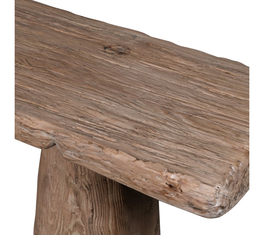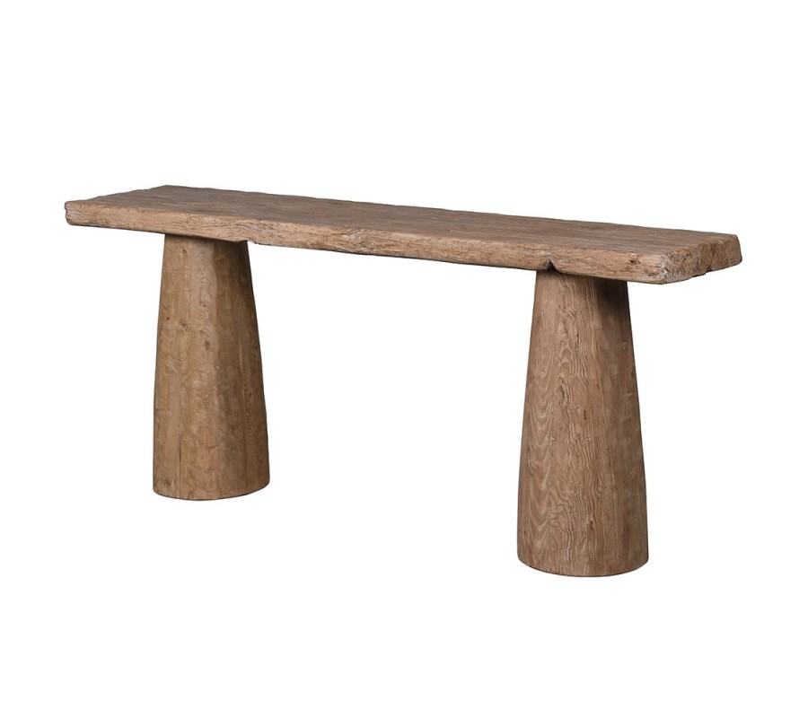 Luxusní etno konzolový stolek Sahari z masivního světle hnědého recyklovaného dřeva se dvěma kónickými nožičkami 184 cm