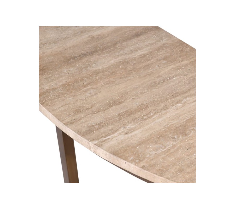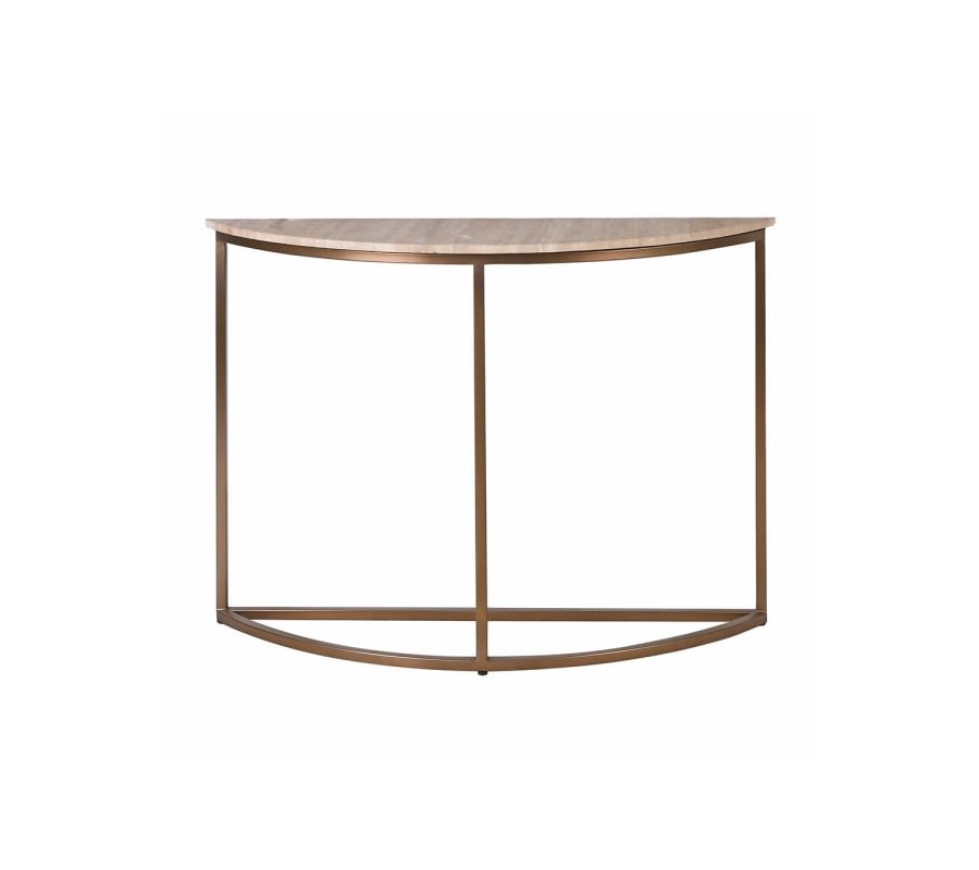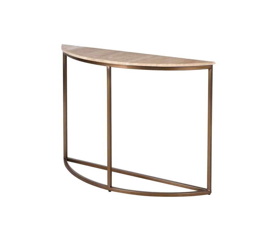 Glamour konzolový stolek Cel s béžovou travertinovou deskou a zlato-bronzovou kovovou konstrukcí v polobloukovém tvaru 110 cm