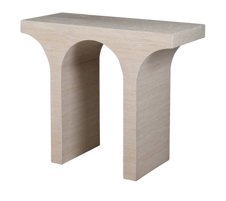 Konzolový stolek Arcus Travertino je dokonalým spojením minimalismu, architektonické elegance a luxusního designu. Vyrobený v jemném krémovém odstínu s realistickým travertinovým povrchem, působí jako sochařský prvek, který do interiéru vnáší harmonii a noblesu.