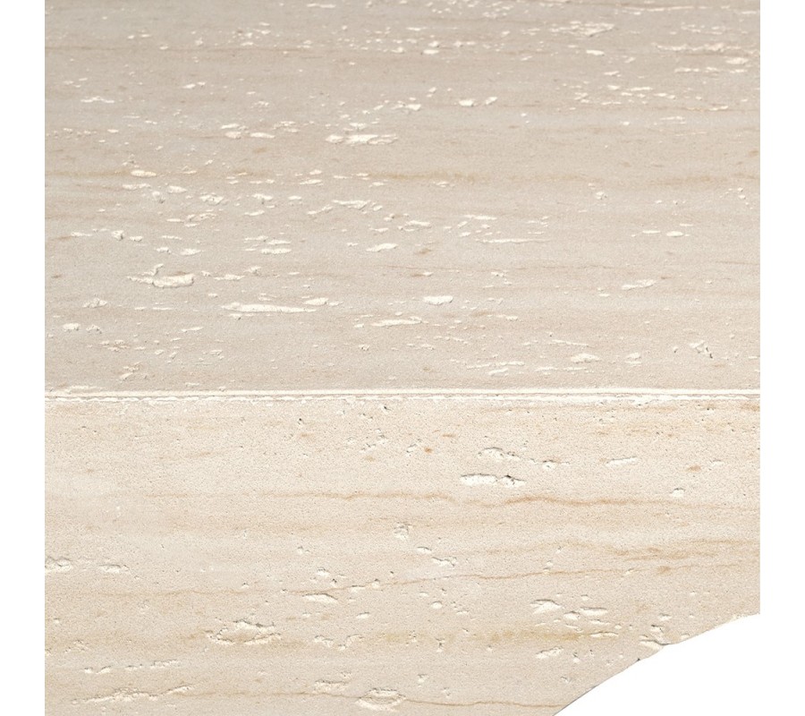 Jeho tvar vychází z čistých geometrických linií – kvádrová vrchní deska je podepřena dvěma masivními nohama s obloukovými výřezy, které připomínají klasické kamenné sloupy. Tato kombinace ostré linie a měkkého oblouku dodává stolku jedinečný architektonický charakter. Povrch s výraznou strukturou kamene vytváří autentický dojem pravého travertinu.