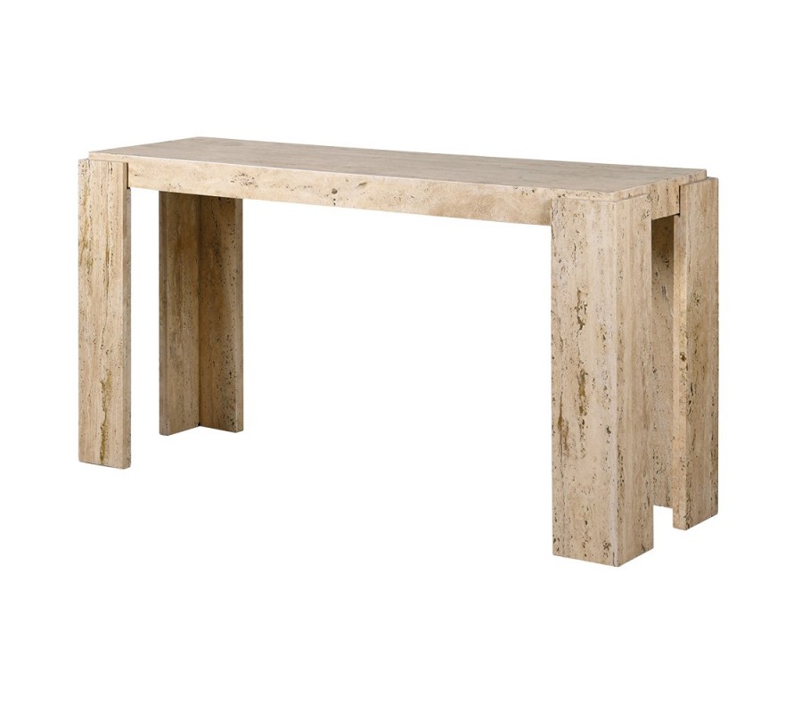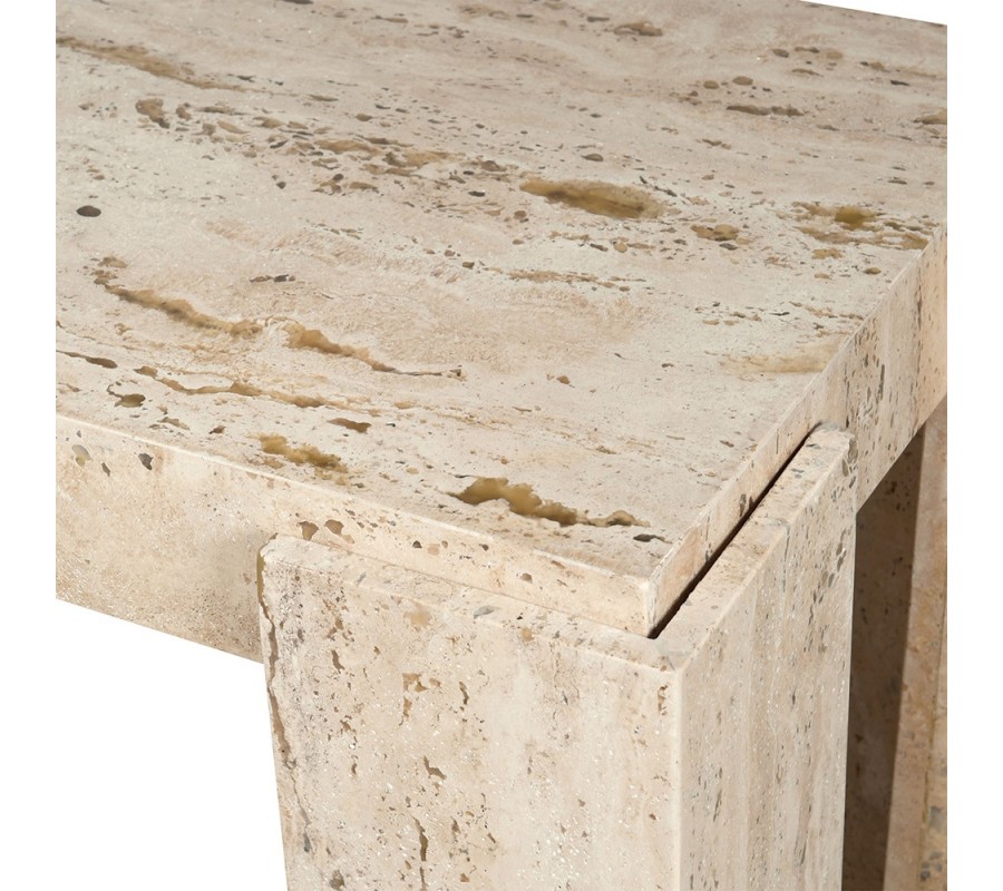 Geometrickyčistý tvar konzoly působí pevně, stabilně a mimořádně elegantně. Úzké, ploché rohové nožičky dodávají stolku vizuální lehkost a moderní architektonický výraz, přičemž vytvářejí vyvážený kontrast k mohutné kamenné ploše. Precizní opracovaný povrch zvýrazňuje přirozenou krásu travertinu a podtrhuje jeho exkluzivní charakter bez zbytečné okázalosti.
