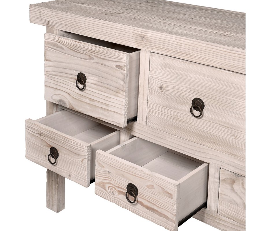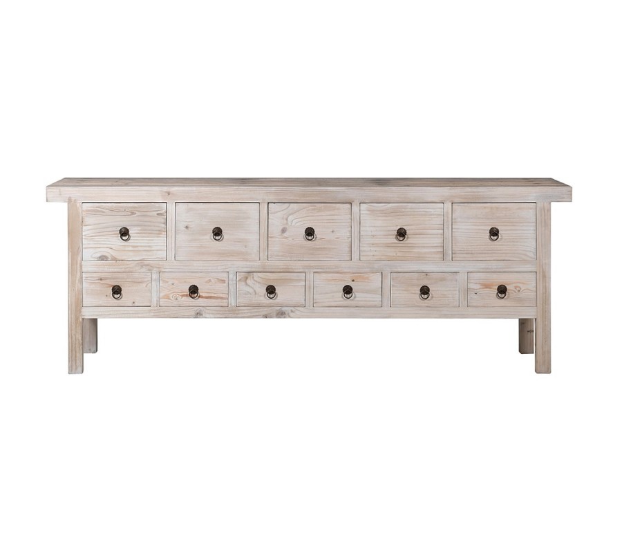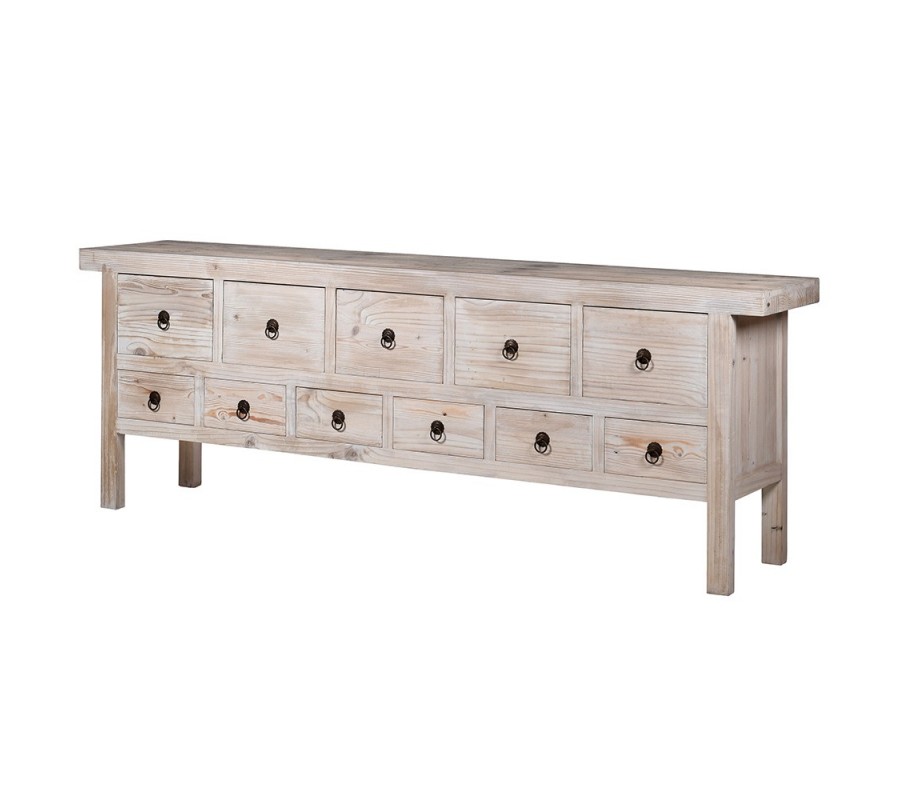 Luxusní venkovský konzolový stolek Thyon s jedenácti šuplíky ve světle hnědé barvě s výraznou patinou dřeva 250 cm