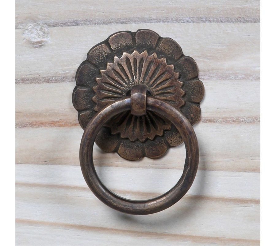 Stolek je vyroben z recyklovaného borového dřeva, které je ekologické a zároveň dodává každému kousku autentický a unikátní vintage vizuál. Světlý krémový nátěr má vymytý efekt, přes který prosvítá hnědá barva dřeva a kresba letokruhů, zdůrazňující masivní charakter materiálu. Kompozici výborně doplňuje mosazná patinovaná povrchová úprava úchytek zásuvek.
