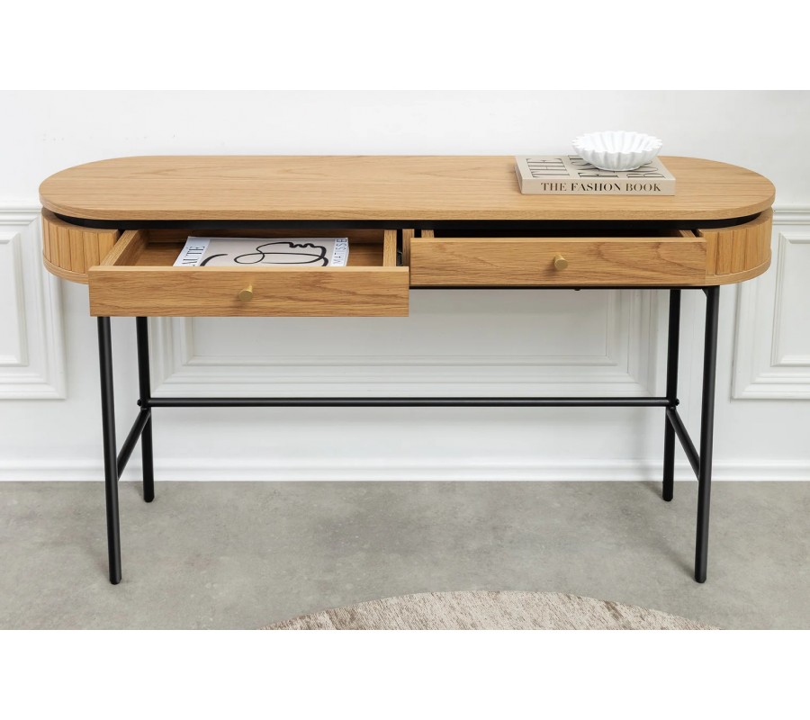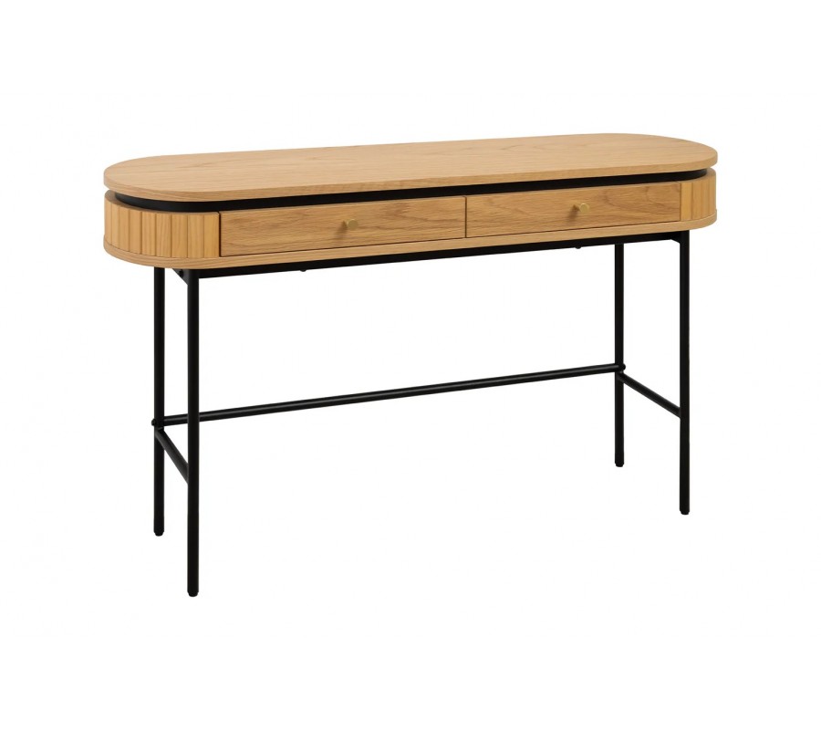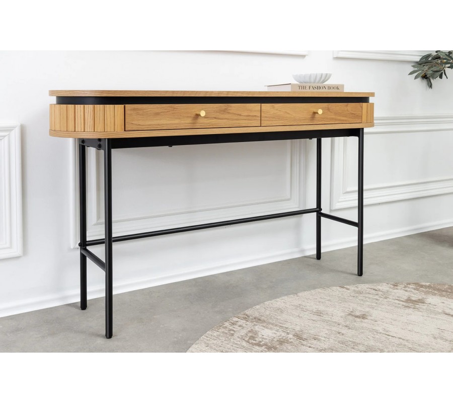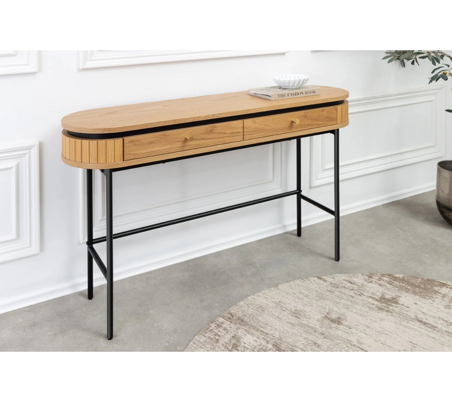 Designový industriální konzolový stolek Maderia s oválnou deskou a dvěma zásuvkami v dubové hnědé a černé barvě 120 cm
