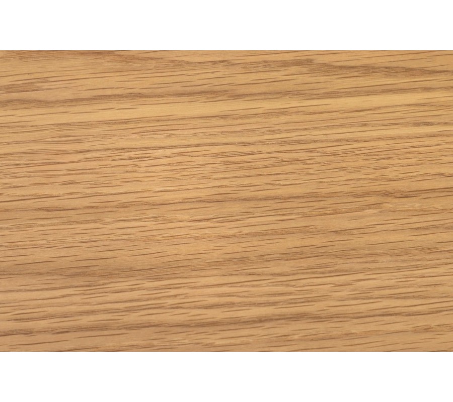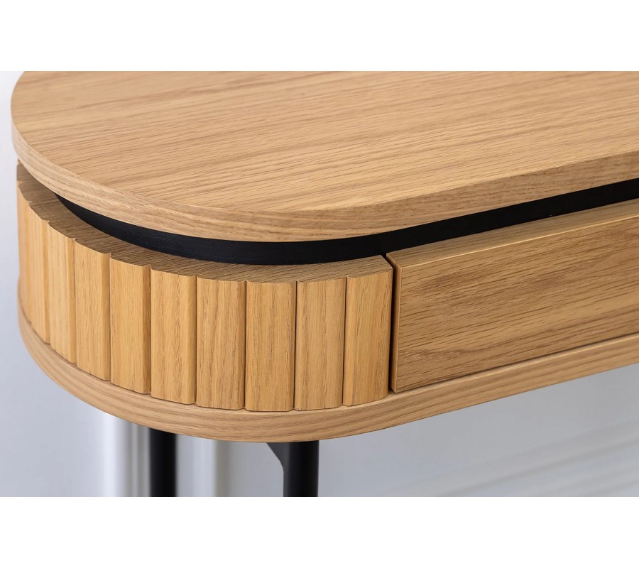 Vrchní část stolku má oválný tvar a je vyrobena z dubové dýhy v přírodním světlém hnědém odstínu s pravidelnou kresbou letokruhů. Pod vrchní deskou se nachází zúžená lišta s černým lakováním, která v kombinaci s kovovou podstavou v matné černé barvě vytváří moderní akcent.