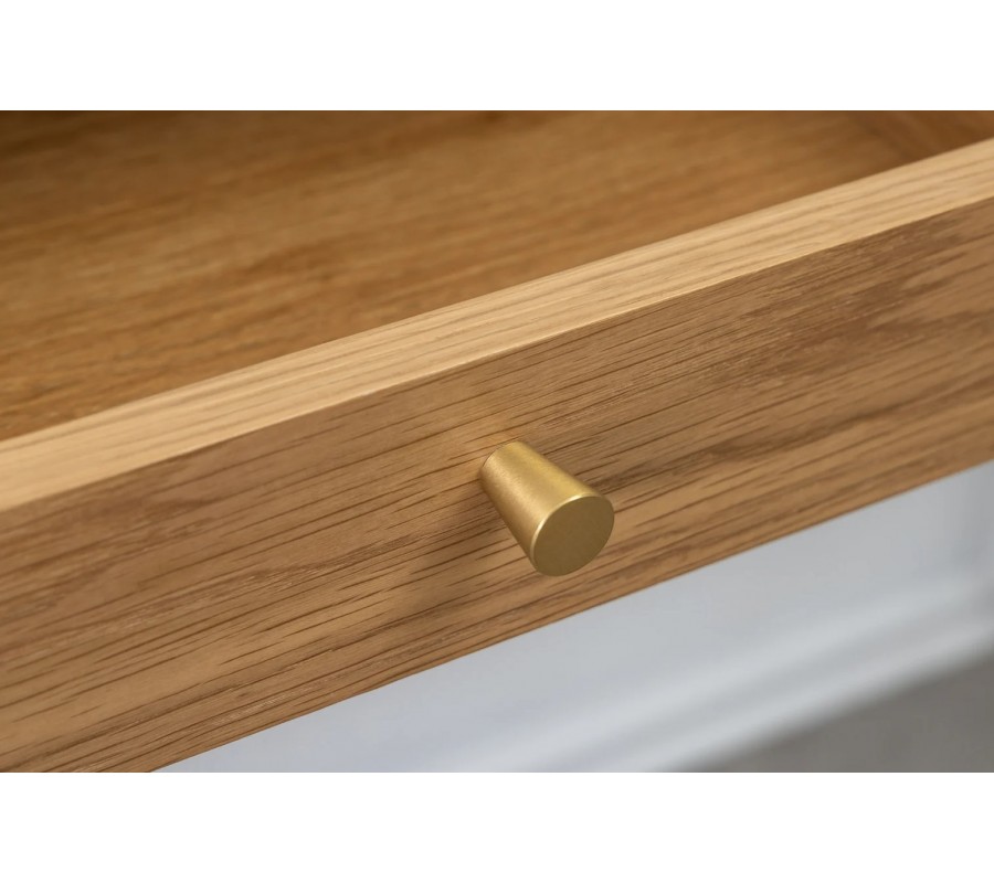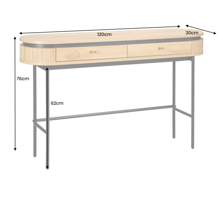 Vrchní deska je hladká, stejně jako čela dvou vedle sebe umístěných zásuvek. Doplňuje je kulatá kovová úchytka ve zlaté barvě a zbývající obvod stolku zdobí vertikální lamelový reliéf, inspirovaný dekorem v art deco stylu. Čtyři nožičky mají štíhlý válcovitý profil a na zadní a bočních stranách jsou propojeny lineární výztuhou. Nábytek je tak stabilní a díky volné přední straně zároveň umožňuje využití prostoru pod ním.