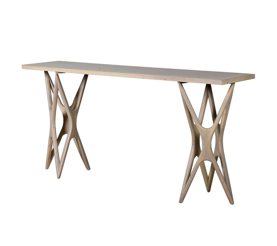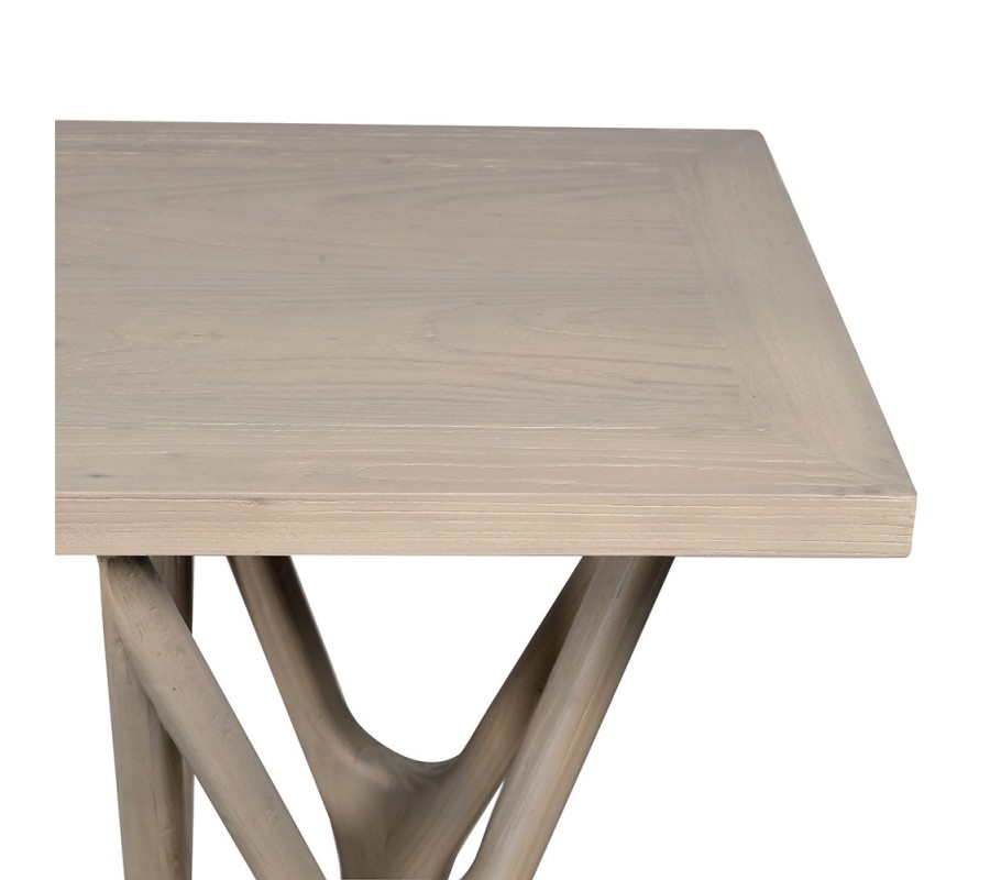 Konzolový stolek má obdélníkovou vrchní desku, vyrobenou z recyklovaného jilmového dřeva. Tento materiál je šetrný k životnímu prostředí a zároveň dodává každému kusu unikátní vzhled. Dřevo má hladký povrch s viditelnou kresbou letokruhů a je upraveno do světle hnědého až krémového odstínu, který působí elegantním dojmem. Okraje desky lemuje rám, který působí jako minimalistický dekorativní prvek.