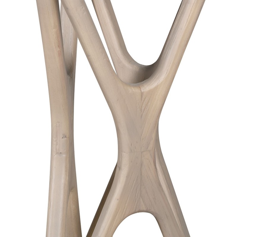 Deska je položena na dvou designových nohách ve stejném barevném provedení. Jsou vyrobeny z dýhovaného dřeva, které umožňuje detailně propracovaný tvar. Každá noha je složena ze tří prvků ve tvaru X, které jsou připojeny vrcholy a vytvářejí vzdušnou válcovitou siluetu s elegantně zúženým středem. Linie a úhly nohou jsou zaoblené. Působí tak plynulým a harmonickým dojmem. Podstava stolku je stabilní, vizuálně odlehčená a zároveň působí vysoce dekorativním, až skulpturálním dojmem.
