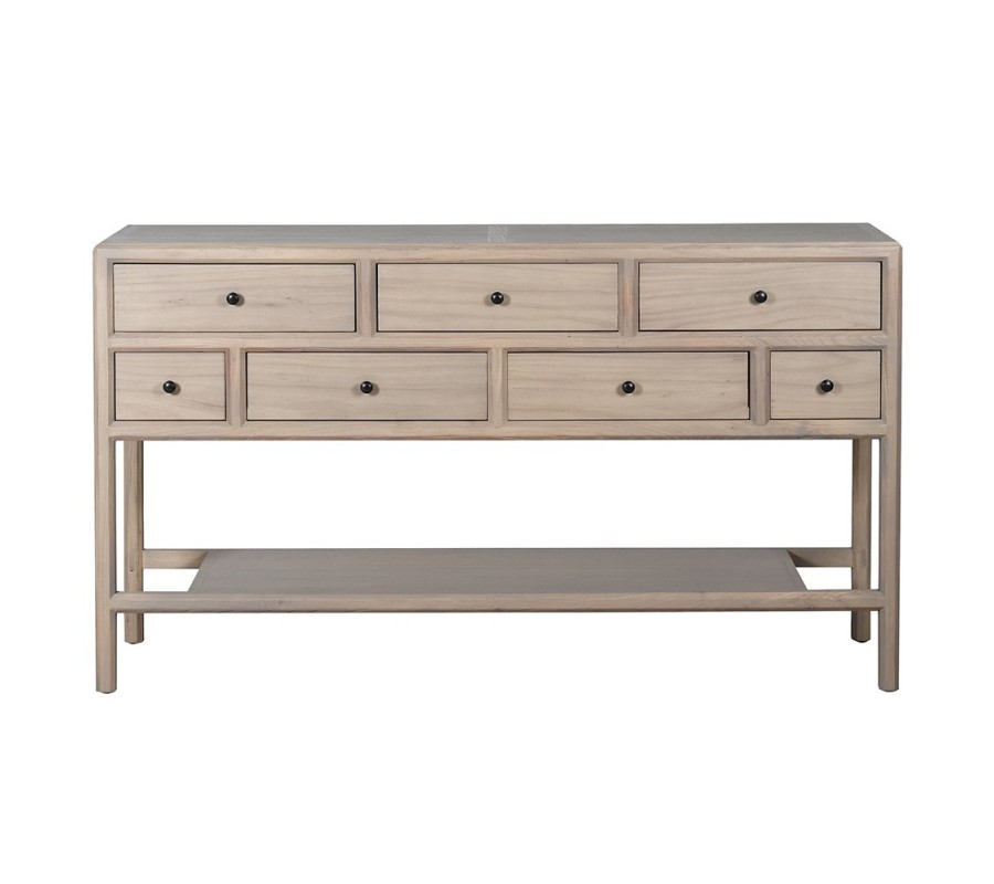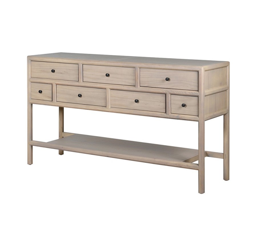 Luxusní skandinávský konzolový stolek Angus se sedmi šuplíky a otevřenou policí ve světle hnědé barvě 160 cm