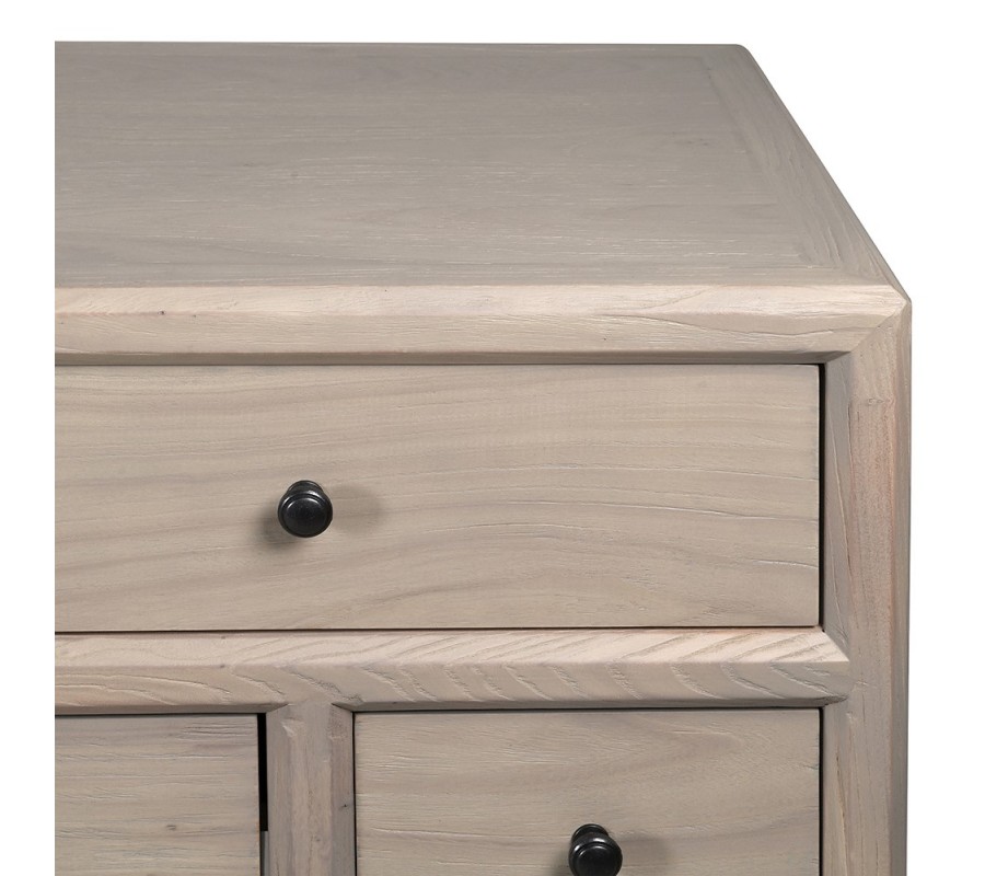 Stolek má obdélníkovou vrchní desku a pod ní je umístěno sedm zásuvek ve dvou řadách. Ve vrchní řadě se nacházejí tři stejně široké zásuvky a ve spodní řadě jsou ve středu dvě široké zásuvky a na každé straně jedna úzká zásuvka. Tato asymetrická organizace působí moderním dojmem a vizuálně nábytek ozvláštňuje. Úchytky jsou vyrobeny z kovu v černé barvě a mají minimalistický kulatý design.