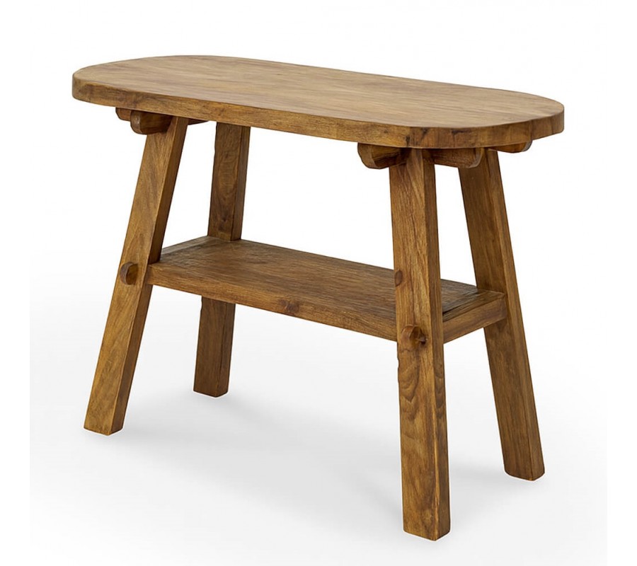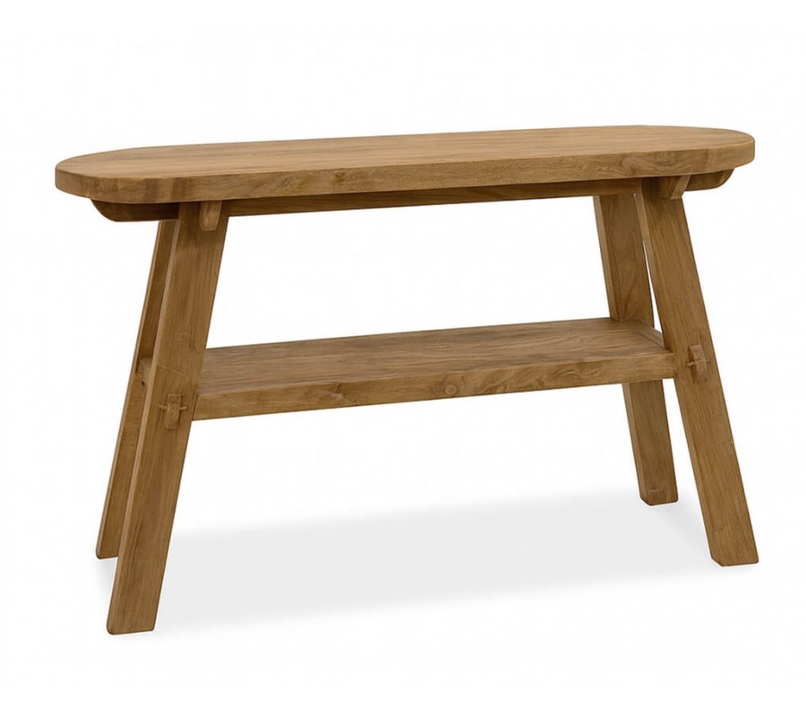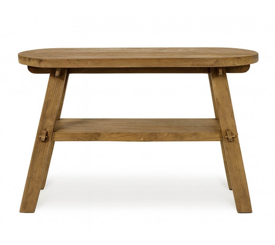 Luxusní venkovský oválný konzolový stolek Shetland s policí a šikmýma nohama z hnědého masivního teakového dřeva 120 cm