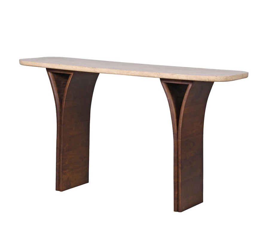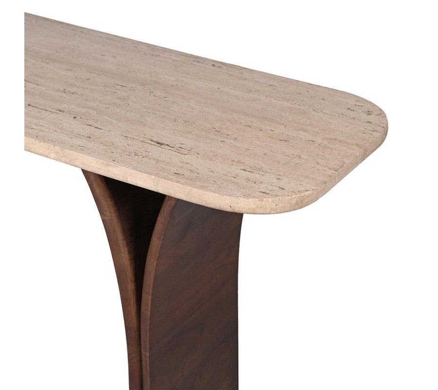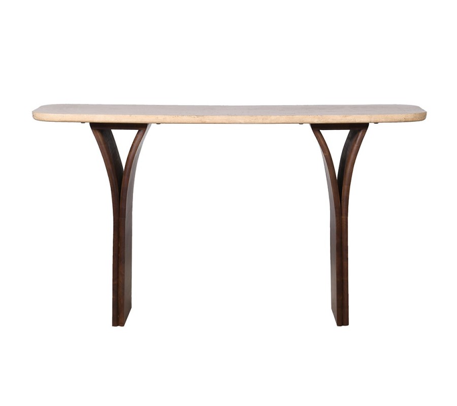 Luxusní mramorový obdélníkový konzolový stolek Jedy s travertinovou deskou a dřevěným akáciovým hnědýma nohama 137 cm