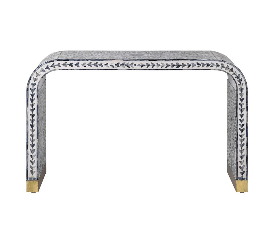 Etno obdélníkový modře bílý konzolový stolek Daytona s oblými rohy s intarzií z buvolí kosti a mosaznými detaily 123 cm