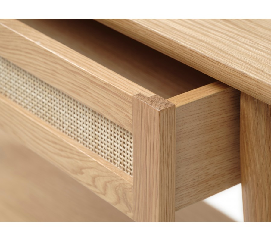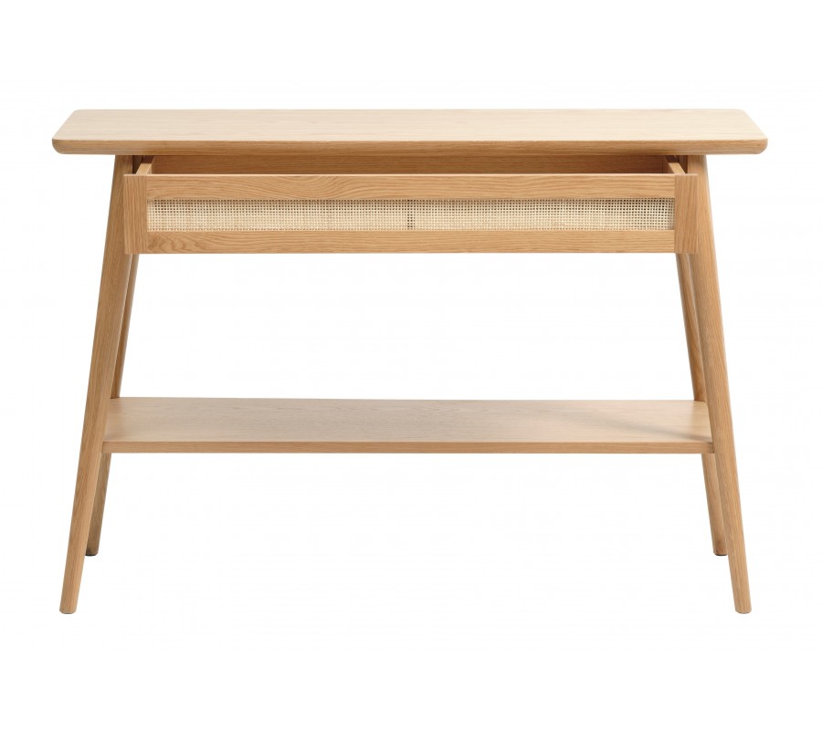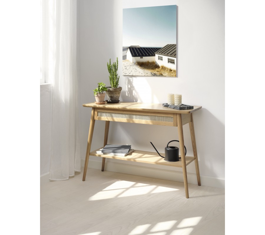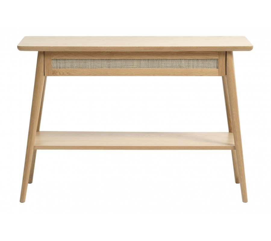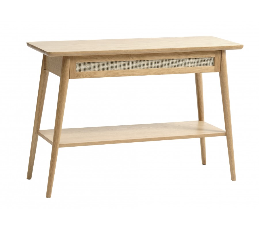 Skandinávský konzolový stolek Aarhus ve světlém dubovém hnědém provedení s policí a šuplíkem s ratanovým výpletem 110 cm